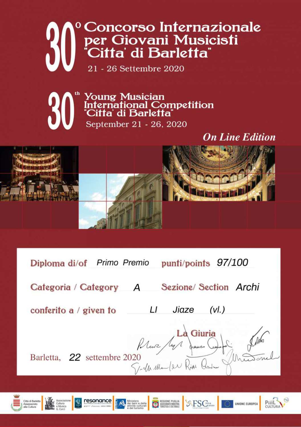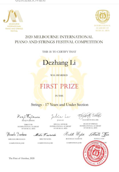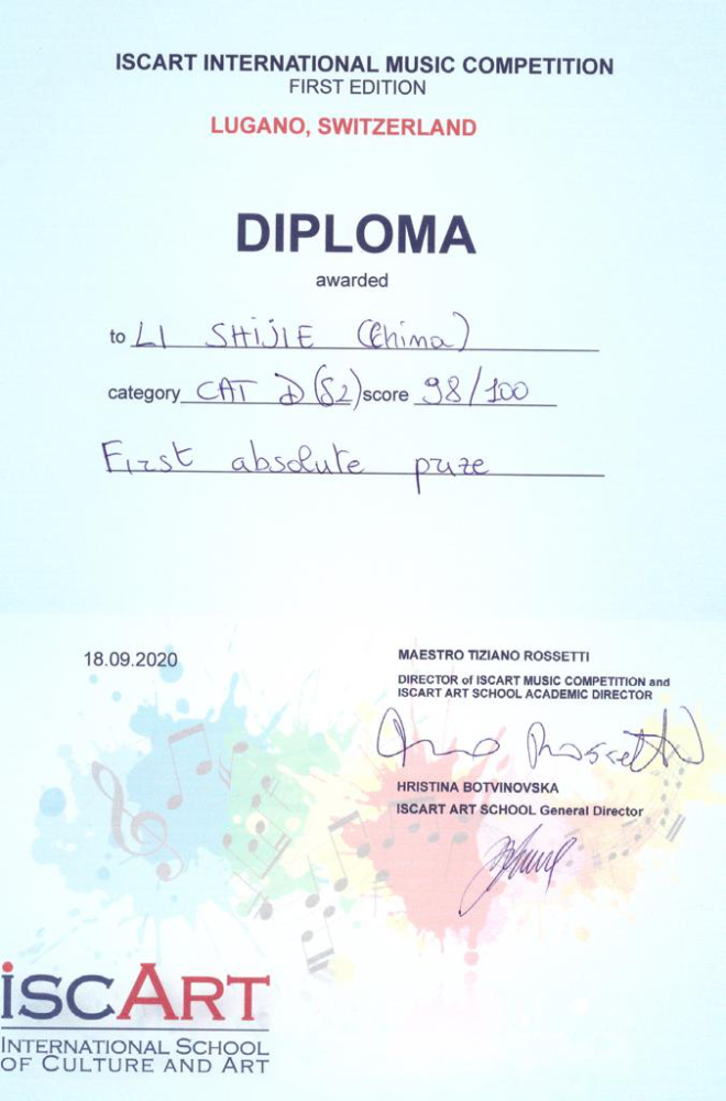 2020年9月荣获第30届意大利巴列塔之城国际青少年音乐家比赛一等奖。