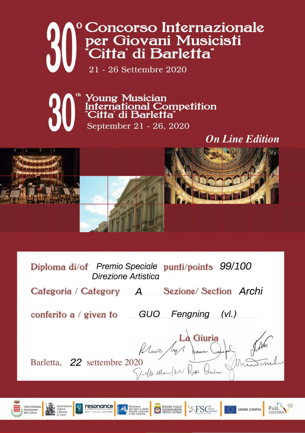 2020年9月荣获第30届意大利巴列塔之城国际青少年音乐家比赛一等奖、音乐家特别奖;