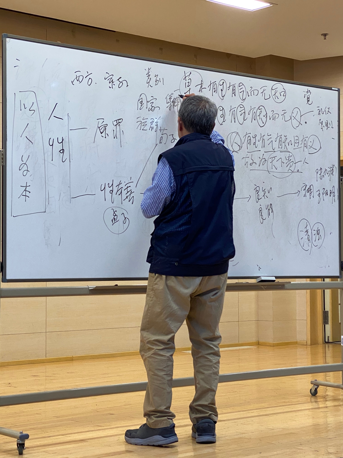 在第二周的课上,守常老师从“养生”谈起。他说在中国人的生活里,儒家经典《论语》已内化在数千年的中国人生活日常里。以中国古人养生为例,《论语》中有“仁者寿”一语,出现了103次。“仁者寿,气之温和者寿,质之慈良者寿,量之宽宏者寿,言之缄默者寿,故仁者寿”。气就是我们说的脾气,一个温和脾气的人就会长寿;人的本质“慈良”,这个人就会长寿;气量宽大,能够容纳你的朋友,宽容反对你的人,就会长寿;包容他人,不争不辨,就会长寿。《论语》里的“仁者寿”,其如上,就是我们古人的养生之道,这些做到了,就会健康长寿,也是生命上的智慧,就是中国的思维方式。”