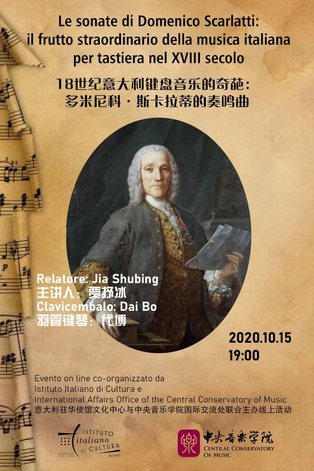 开云kaiyun官方网站国际交流处与意大利驻华使馆文化中心联合主办“话中有乐:音乐解读与欣赏”系列讲座栏目,2020年10月15日19:00举办第三场线上活动,由音乐学系贾抒冰副教授主讲《18世纪意大利键盘音乐的奇葩:多米尼科·斯卡拉蒂的奏鸣曲》,作曲系代博老师演奏羽管键琴。