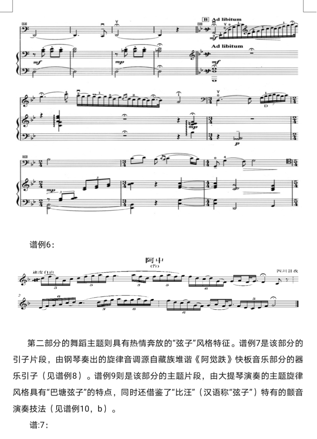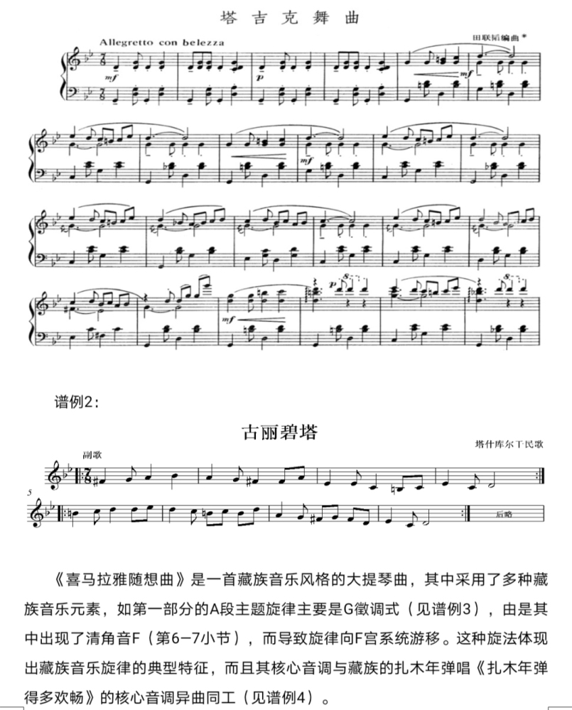 田联韬先生作为《中国少数民族传统音乐》一书的主编,不仅负有统筹编辑宗旨、通审之责,而且还命笔撰写了其中一些篇章。由他参与执笔的“藏族传统音乐”(第23章)、“傣族传统音乐”(第29章)、“佤族传统音乐”(第32章)、“仫佬族传统音乐”(第50章)以及“克木人传统音乐”(附录一)、“夏尔巴人传统音乐”(附录二)、“僜人传统音乐”(附录三)等,在不少章节中都贯穿着作曲家视角的分析。如他在论及藏族音乐形态特征时说:“虽然藏族民间音乐以釆用五声调式音阶为主,但有些地区的音乐或某些乐种,曲目却具有非五声性的特点,而采用了六声或七声音价……而四川阿坝藏族自治州嘉戎藏人的不少民歌和歌舞音乐,则采用了含有升fa和降si音的比较特殊的调式音阶。”他对藏族音乐特征的阐释,是很有说服力的。