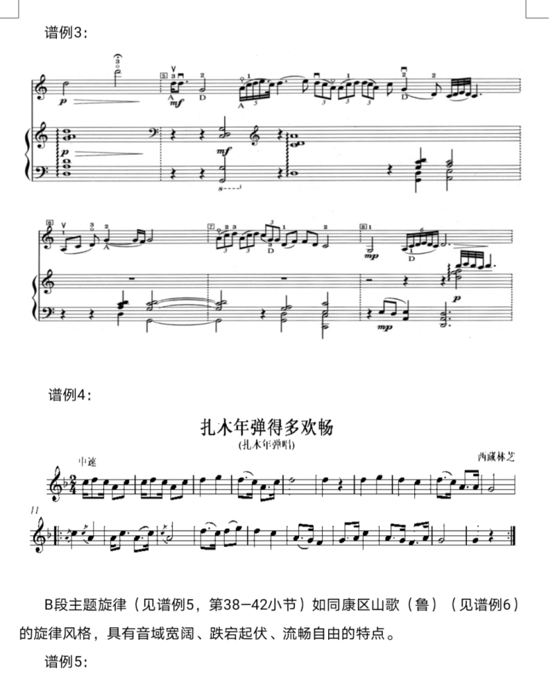 数十年的少数民族音乐研究经历,田老师等老一辈学者积累了丰富的经验和相当系统的理论与方法,重视“音乐本体”的研究便是其中之一。这一理念,与我国传统的“民族音乐理论”、“民族音乐研究”、“民族民间音乐研究”的传统一脉相承,或者说是在不同的研究领域里所形成的共识,殊途同归。少数民族音乐研究,它的“音乐本体”(即音乐的内部结构)理之当然是其研究的主要对象,绝对不可或缺,离开或缺失其主要研究对象——“音乐本体”的研究,就有可能变成别的什么学科的研究,已不属于少数民族音乐研究的范畴。回眸田老师对少数民族音乐的研究,不管是全面系统地研究某一民族的音乐,还是研究某一个音乐品种,抑或是研究某个音乐事项,无一不重视“音乐本体”。比如他的《藏族传统音乐》,研究中所涉及的音乐品种,包括民间音乐中的民间歌曲(山歌、劳动歌、情歌、风俗歌、嘛呢调、扎木年弹唱),歌舞音乐(果谐、堆谐、囊玛、康谐、谐钦、热巴卓与热巴谐),说唱音乐(仲谐、折嘎、喇嘛嘛呢、贝翁、嘛呢窘阔),戏曲音乐——藏戏,民间乐器与器乐(扎木年、比汪、根卡、鹰骨笛);宗教音乐里的诵经调、羌姆乐舞音乐、寺院器乐音乐;宫廷音乐等等,每一种都作了深入细致的研究,予以详尽论述,附以实例佐证,文、谱并茂。文章以实实在在的音乐成品为据,列举的39条谱例充分展现出藏族传统音乐历时与现时的存见状况;其音乐形态的分析与论述,则又高度概括了藏族传统音乐的音阶调式、节奏节拍、曲式结构、唱词格律等等方面的基本特征。透过如此这般的论述,藏族传统音乐的形貌及其特色跃然纸上、呼之欲出。