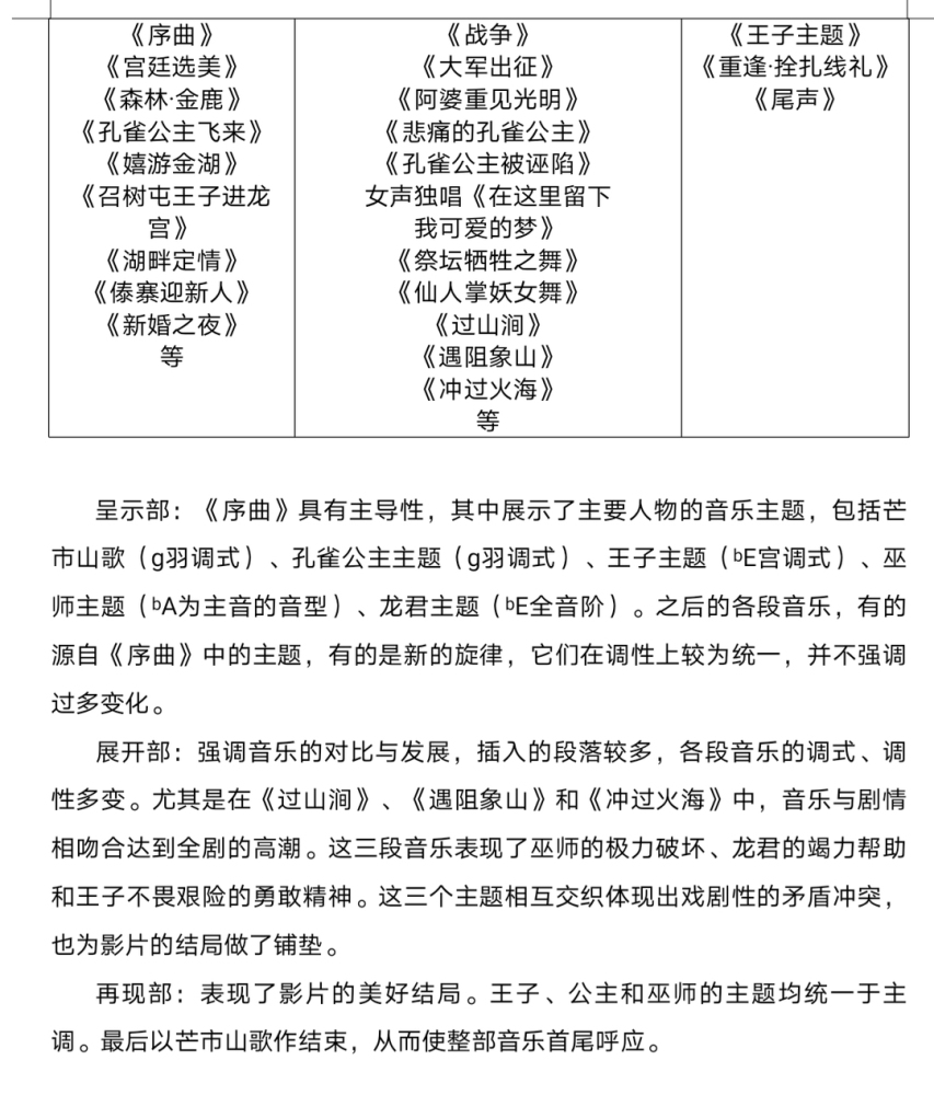 另外,在电影音乐《孔雀公主》中,作曲家根据傣族题材还以云南德宏州的傣族城子山歌“喊嘛勒姐”的曲调为基础,按照人物和情节的表现需要将其变化发展,塑造出多姿多彩的音乐场景,并为跌宕起伏的戏剧性情节营造气氛。
