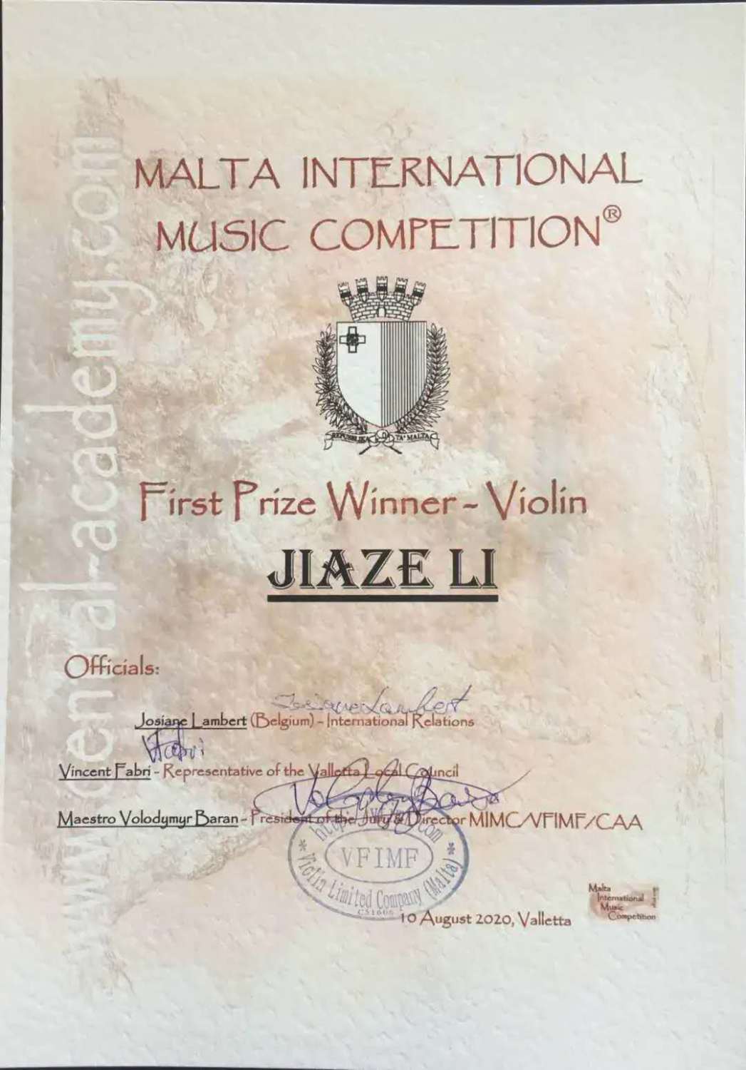 马耳他国际音乐比赛由马耳他中央学院主办,分为junior I,II,III组和成人ADULT组。设有器乐独奏、室内乐、提琴制作等分类。今年因为疫情原因改为以网络比赛的形式进行。2020年共收到36个国家参赛者的参赛。