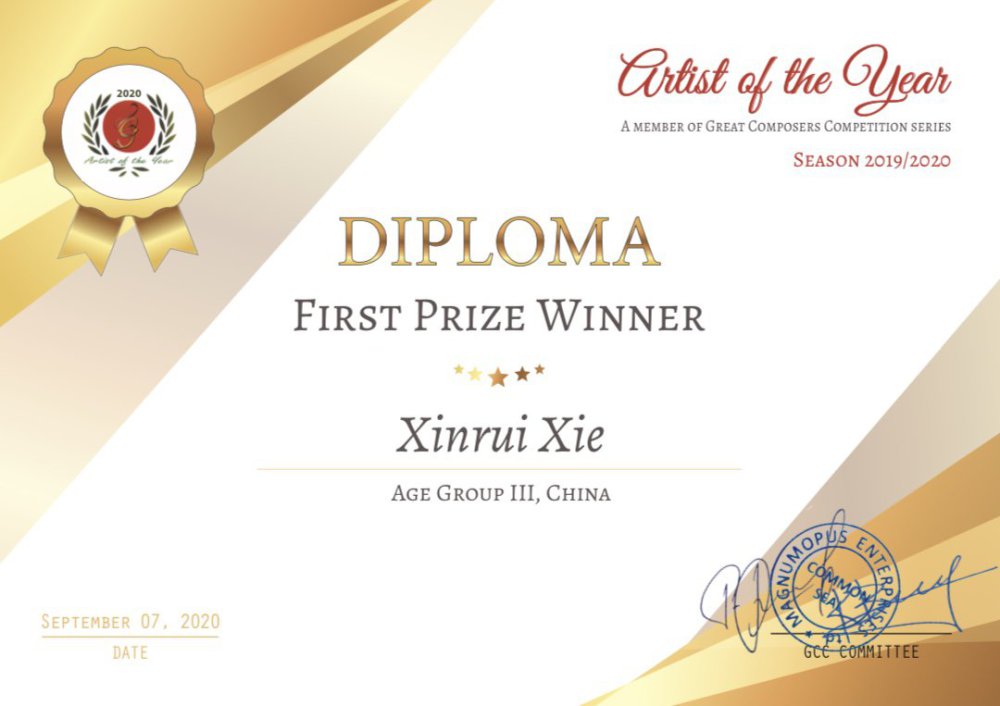 2018年香港国际小提琴大赛少儿专业组三等奖。2019年6月25日获得第二届乌克兰利沃夫国际青少年小提琴比赛A2组第一名。2020年6月塞尔维亚国际音乐比赛—小提琴比赛Vll组第一名;同年7月或比利时布鲁塞尔柯冈国际小提琴比赛特别推荐奖及亨里克·维尼亚夫斯基作品最佳演奏奖比赛一等奖。