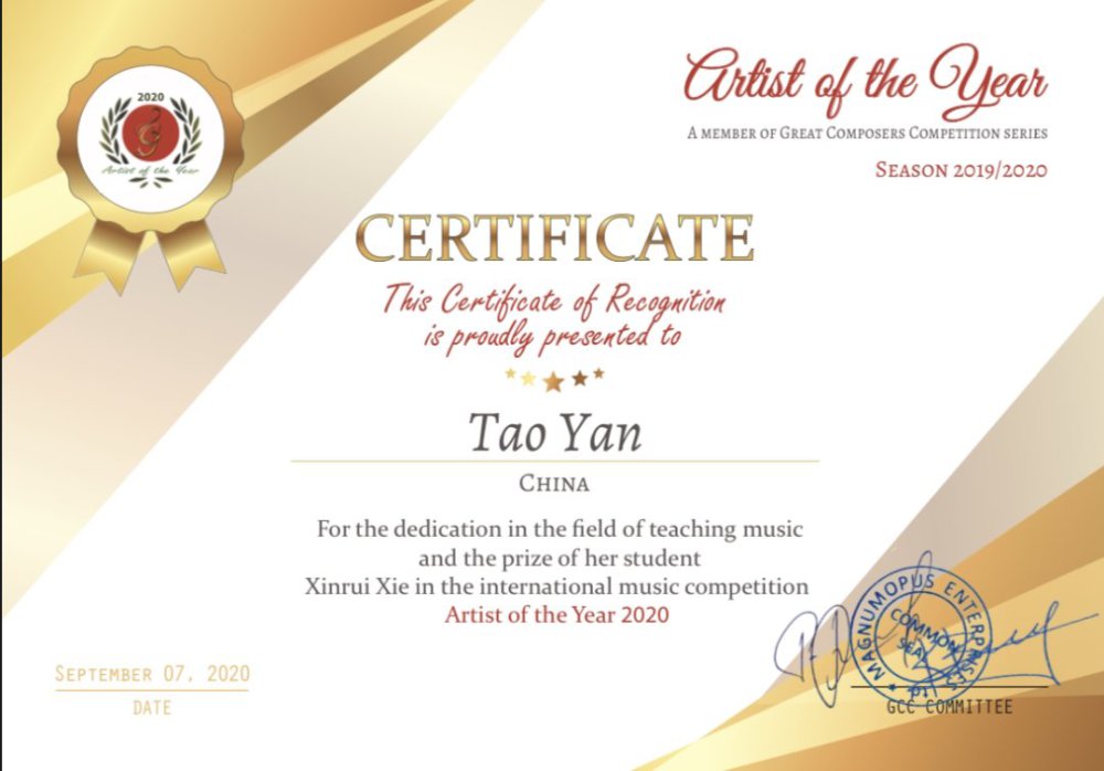 2019年入选第22届北京国际音乐节少儿节日乐团,参与“纪念巴赫诞辰200周年公益音乐会”演出。