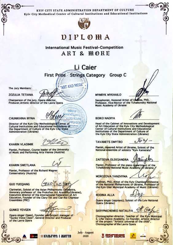 2020年乌克兰Art&More国际音乐节比赛中获弦乐组一等奖;