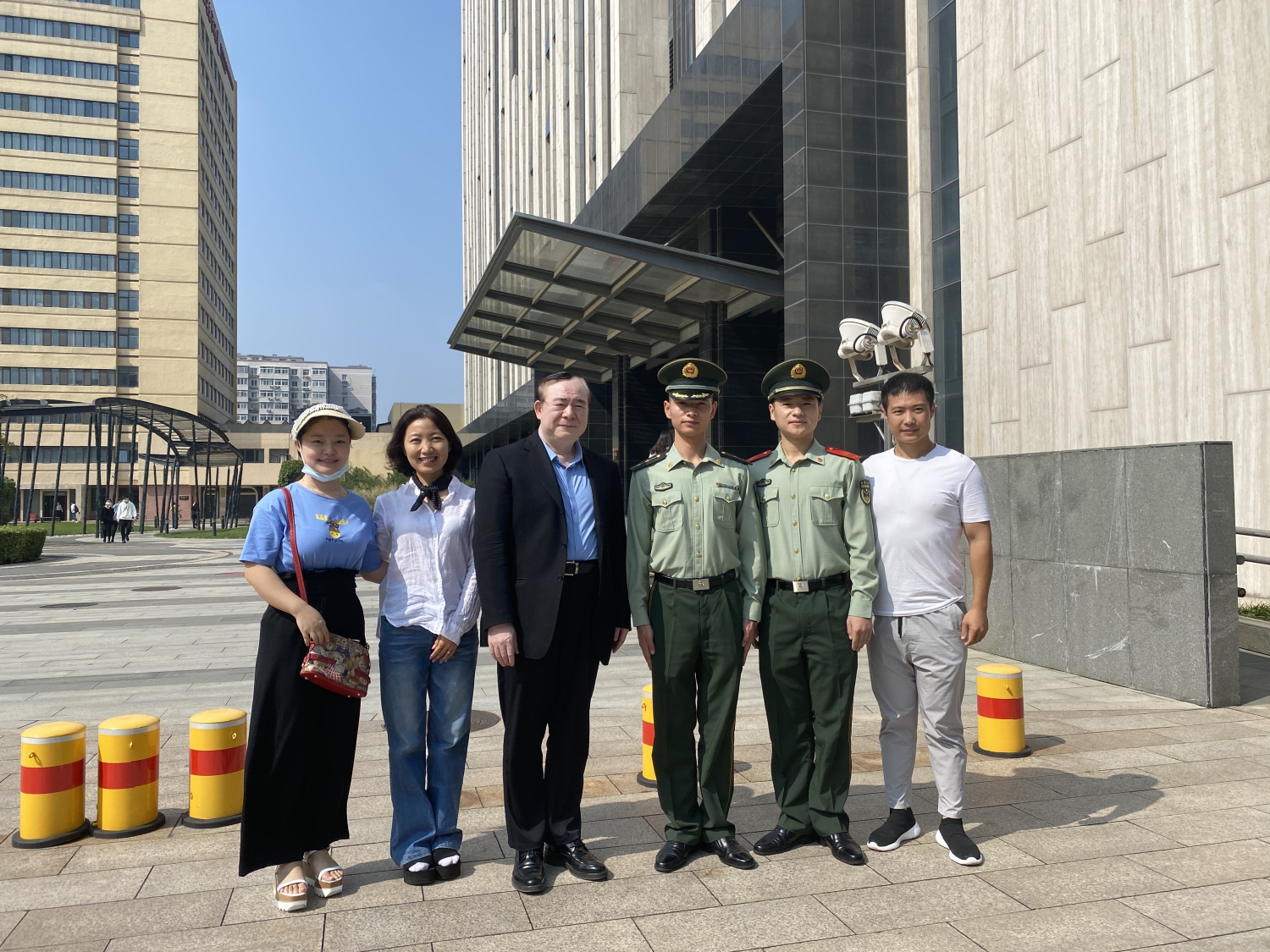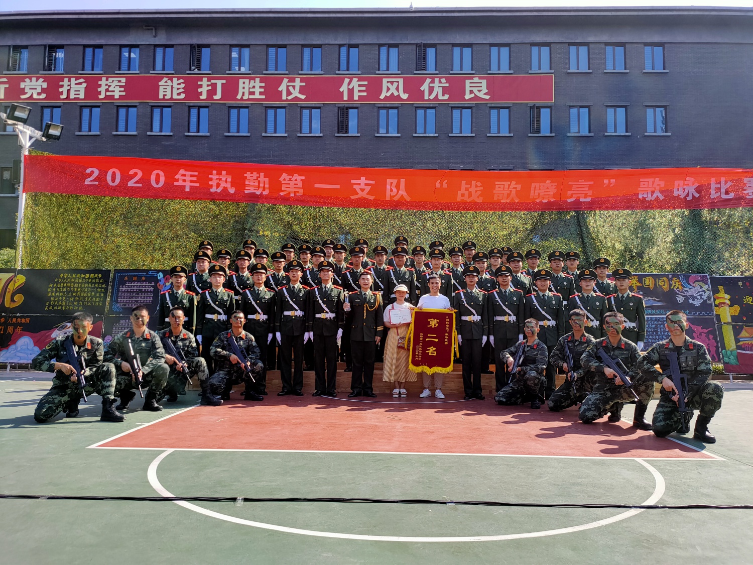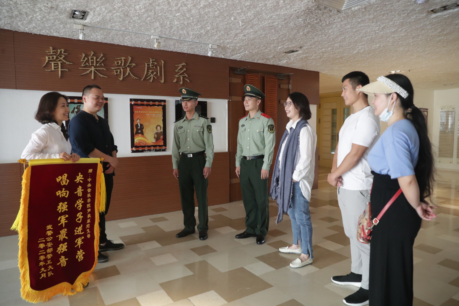 2020年9月25日上午,武警天安门支队国博中队的领导和战士来到开云官网,代表天安门支队为声歌系党总支送来了一面锦旗,对于声歌系学生为战士们辅导排练合唱取得的丰硕成果表示感谢,并希望声歌系与支队的共建工作继续更好的开展。