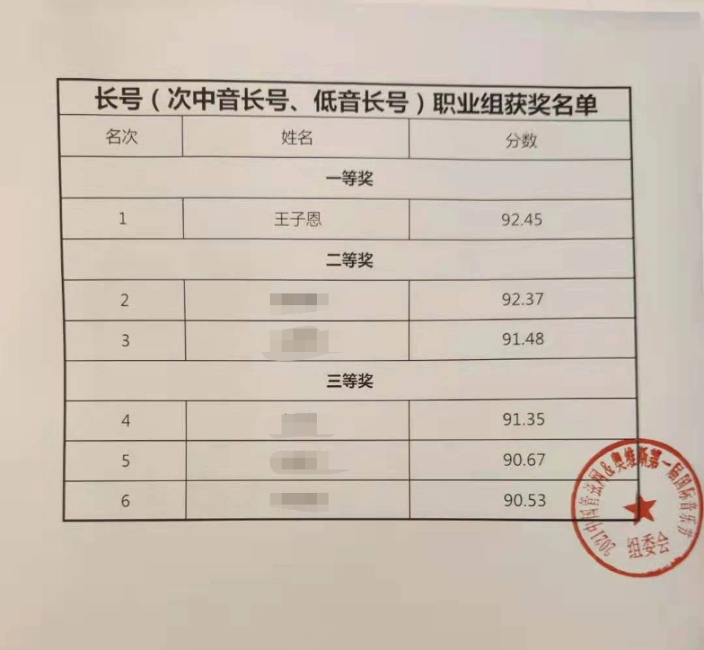 开云官网附中初一年级学生王子恩(指导教师:刘洋教授,钢琴伴奏:许歌卉、梁瑶),作为职业组年龄最小的选手,与来自全国各大音乐专业院校的大学生、研究生以及全国各专业演奏团体演奏员同台竞技。经过初赛(总分第二)、复赛(总分第一)、决赛三轮淘汰赛,最终以92.45分的成绩荣获长号(次中音长号、低音长号)职业组金奖,获得此类赛事亚洲最高奖金6万元人民币。也是自中国国际低音铜管艺术节长号大奖赛举办以来,第一个以低音长号乐手身份获得职业组金奖的选手。