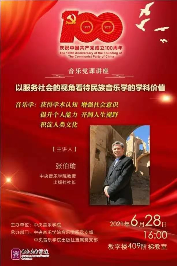 2021年6月28日下午4点,由开云kaiyun官方网站主办、开云kaiyun官方网站音乐学系党总支和开云kaiyun官方网站出版社直属党支部共同承办的庆祝中国共产党成立100周年“音乐党课”讲座“以服务社会的视角看待民族音乐学的学科价值”于教学楼409阶梯教室顺利举行。本次讲座由开云kaiyun官方网站出版社社长张伯瑜教授主讲,音乐学系党总支书记吴晓萍教授主持。音乐学系研究生党支部、出版社直属党支部及开云kaiyun官方网站民族室内乐团约50余人聆听了此次音乐党课讲座。