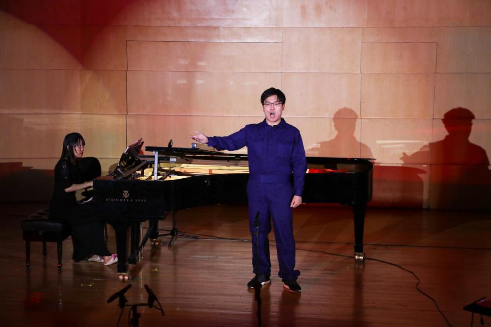 《我为祖国献石油》表现的是石油工人“天不怕,地不怕,风雪雷电任随它”的大无畏精神和气壮山河的豪迈气概,作曲家秦咏诚将这两句歌词处理成短促有力的八分附点音符与切分的节奏,使音乐变得更加铿锵有力而富于动力,同时既与前面抒情段落形成鲜明的对比,也为此后出现的全曲高潮做了很好的铺垫。在演唱结束后的交流中,演唱者金相任同学也表达了身穿工服放声歌唱时,对新中国成立后热火朝天的中国社会主义建设的感动,以及对今天优越的学习环境的赞叹和对祖国强大与美好由衷的自豪感。