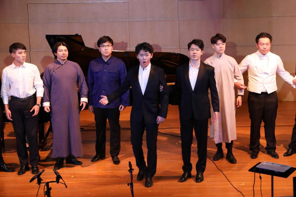 讲座音乐会的开场十分特别,在漆黑的音乐厅会场中,首先从观众席传出一位男声哼鸣低吟的《国际歌》曲调,紧接着这熟悉的音调从四面八方的男声吟唱渐次响起,最终汇聚成一股慷慨激昂的声音洪流回荡在整个音乐厅中。当音乐厅的灯光完全照亮时,我们看见13位由声乐歌剧系学生扮演的中共一大与会代表,肩并肩,手挽手,高唱着《国际歌》,重现了革命先驱的豪情壮志。现场的歌声仿佛将观众带回了1921年中国共产党成立的那一刻,唱响了中国共产党从萌芽到创建,从星星之火到燎原之势的长歌。