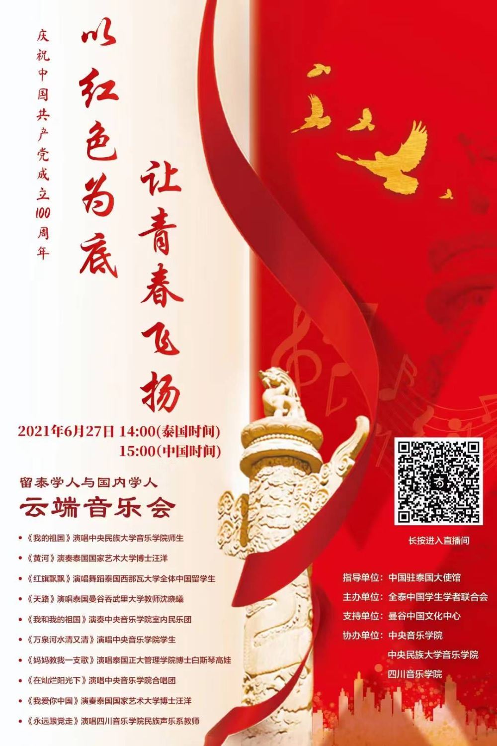 经过国际交流处与中国驻泰国大使馆的多次协商沟通和精心策划,云端音乐会取得了圆满成功,在线观看12.5万人次,获赞35.1万个。此次活动得到了中泰两国各界人士的充分肯定,展现了当代青年学子朝气蓬勃、时尚靓丽的青春风貌和海内外学人共同庆祝中国共产党成立一百周年的喜悦之情。