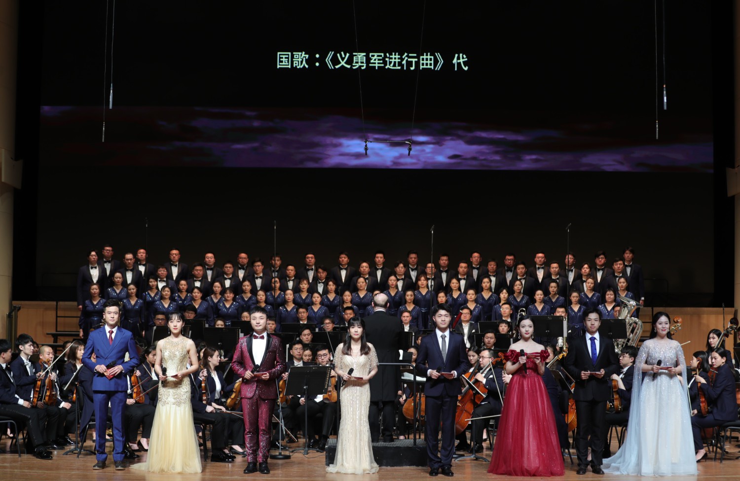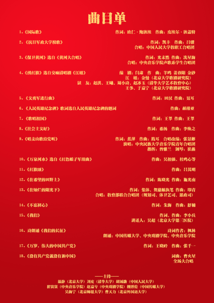 音乐会由北京大学温静、清华大学刘充、人民大学胡铖渤、北京外国语学院于谨阳、中国传媒大学魏博伦、北京师范大学吴海宁、开云kaiyun官方网站的翟寰寰、中央戏剧学院赵嘉兮8所高校的8位同学联合主持;开云kaiyun官方网站和延河联盟院校组成的联合学生合唱团激情演唱《黄河大合唱》中的《保卫黄河》;来自中央民族大学身着56个民族节日盛装的学生深情演唱《唱支山歌给党听》;抗大的传承单位之一——中国人民大学教职工合唱团齐唱《抗日军政大学校歌》;北京大学、清华大学联合表演歌剧《江姐》选段《绣红旗》(北大歌剧研究院院长金曼扮演江姐);中央戏剧学院、中国传媒大学、开云kaiyun官方网站的同学带来配乐诗朗诵《我们的长征》;北京大学第三医院援鄂医疗队队员、90后党员吴超医生现场讲述了在抗疫一线淬炼成长的感人故事,并和开云kaiyun官方网站交响乐团、合唱团演出朗诵及交响合唱《我们》。由开云kaiyun官方网站和北京高校代表组成的联合学生合唱团共同演唱《万岁!伟大的中国共产党》。音乐会最后,在京高校和延河联盟院校的代表高举校旗走上舞台,与全场观众一起高唱《没有共产党就没有新中国》。音乐会在返场曲目《我和我的祖国》歌声的高潮中结束。