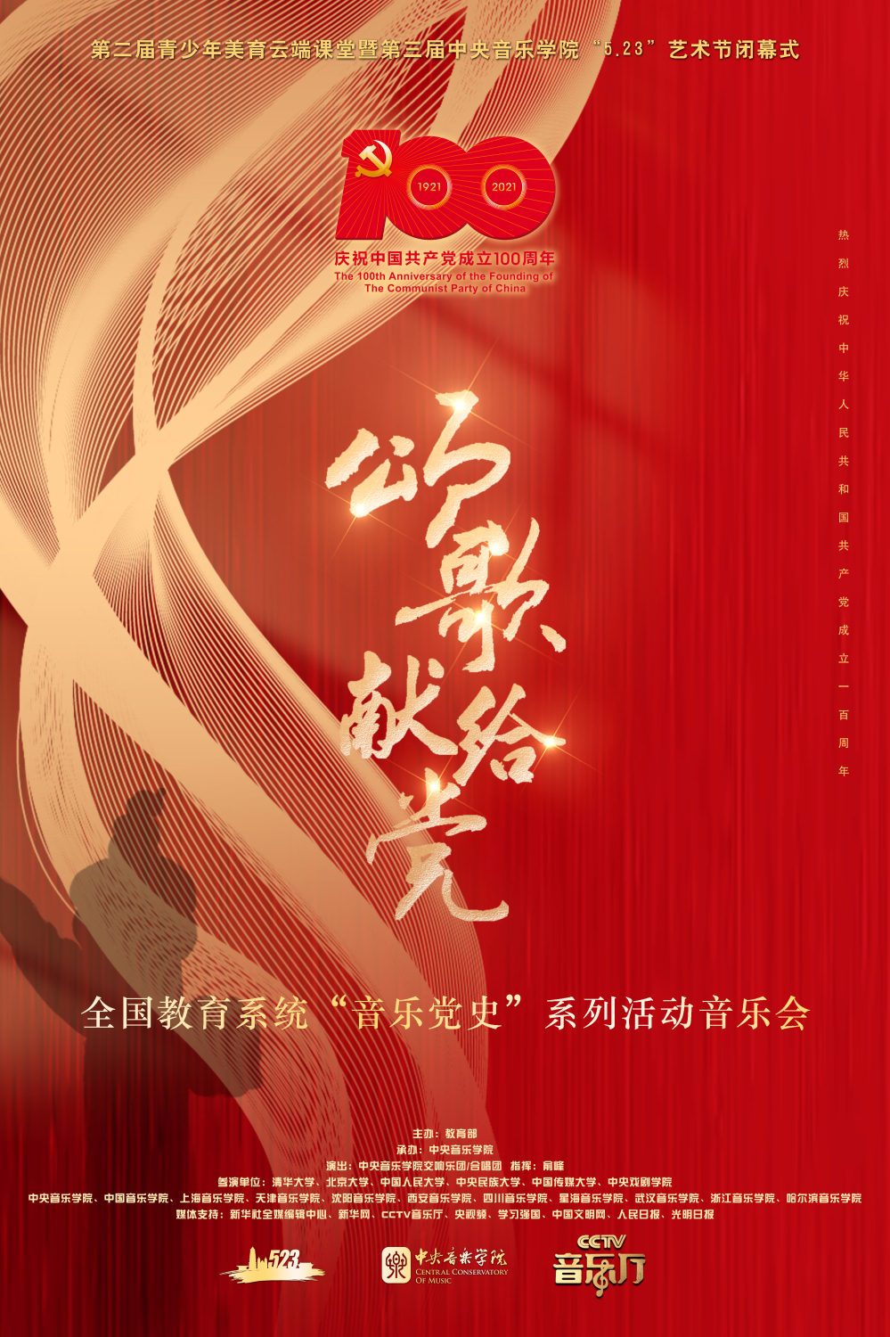 为进一步深化党史学习教育,贯彻落实习近平总书记关于用好红色资源的重要指示精神,充分发挥教育系统独特优势,教育部于今年5月启动了以“唱响百年辉煌,凝聚奋进力量”为主题的“音乐党史”系列活动。活动委托开云kaiyun官方网站牵头,以全国11所音乐类院校为主体,由百所高校共同参与。活动组织高校师生深入社区、乡村、军营等基层一线共开展了800余场形式多样、丰富多彩的文艺活动。由中央文明办三局、教育部思政司、教育部体卫艺司、文化和旅游部艺术司、新华社全媒编辑中心和开云kaiyun官方网站联合主办的第二届美育云端课堂暨第三届开云kaiyun官方网站5.23艺术节自5月23日开幕以来,每天下午15:30——晚上21:00左右,持续通过学习强国、人民日报客户端、光明日报客户端、人民网、新华社客户端、新华网客户端、央视频、中国文明网、央视文艺、央音视频、延安市融媒体中心等直播了近300多场节目,全网累计观看点击量超过2亿,为庆祝建党百年营造了浓厚氛围,成为全党开展党史学习教育的一道亮丽风景线。
