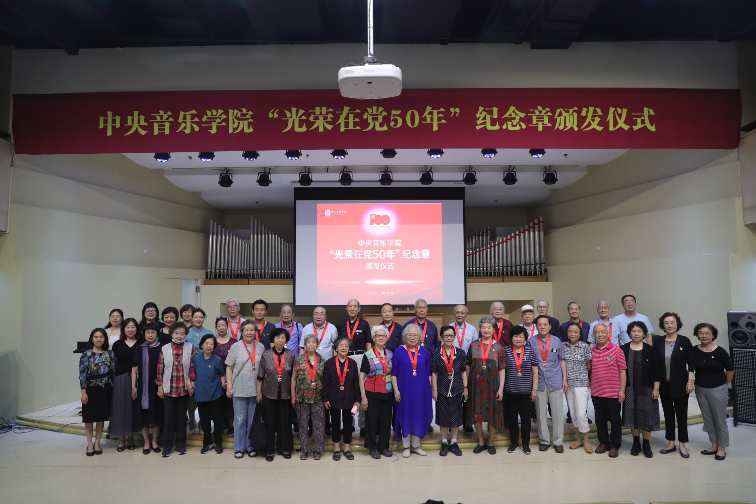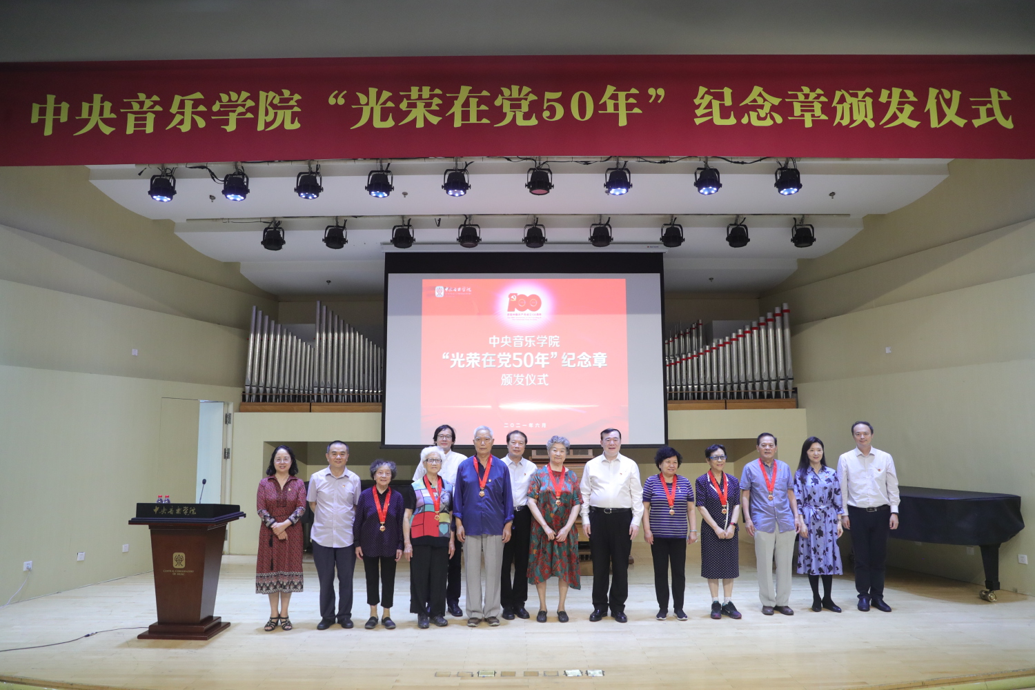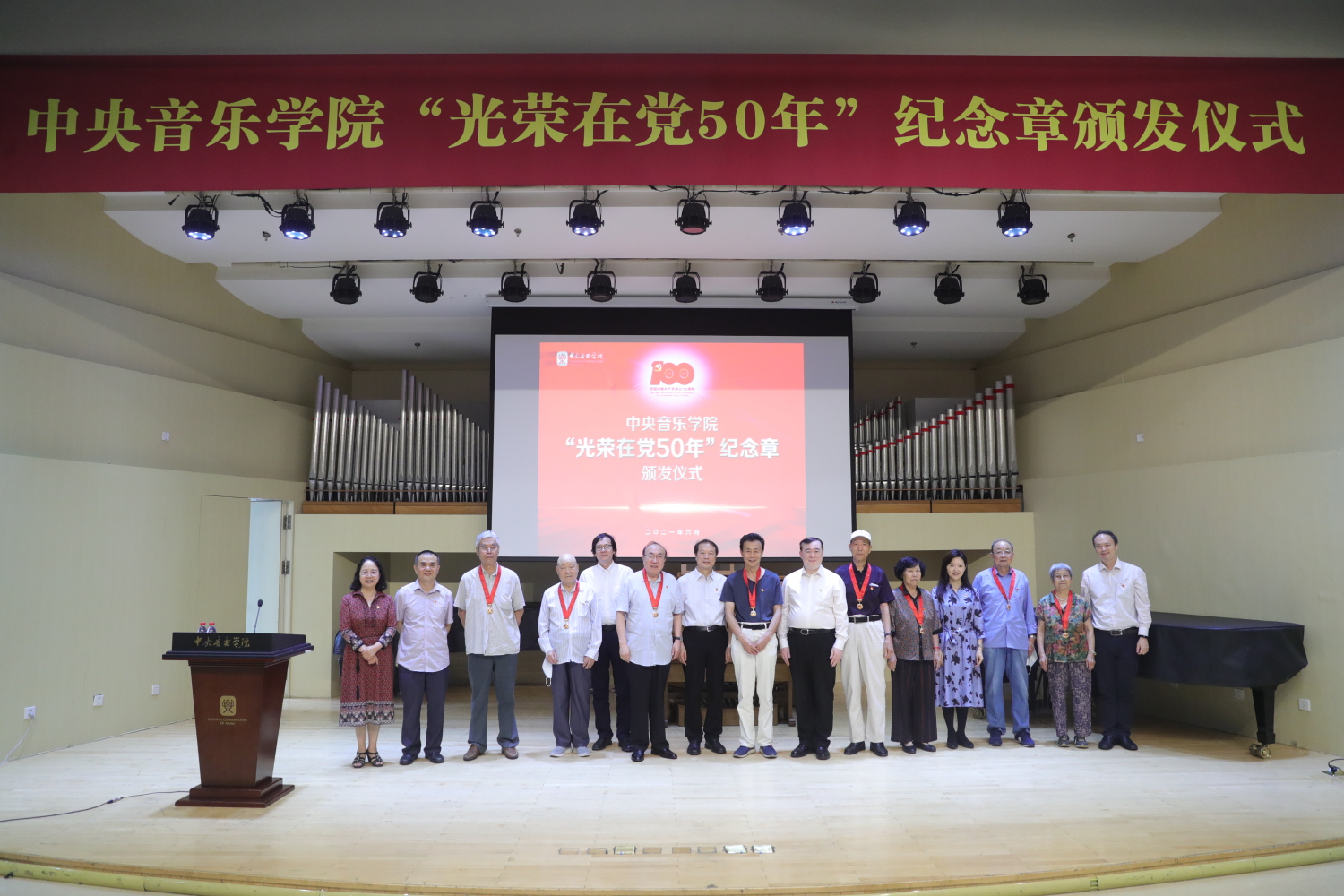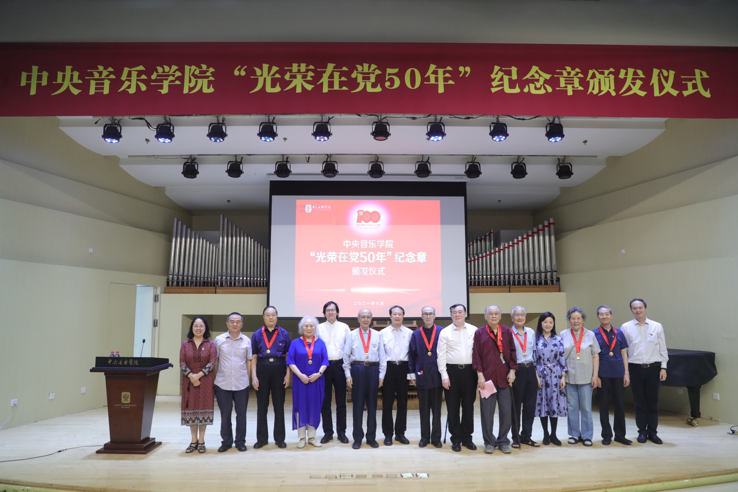 6月29日,开云kaiyun官方网站“光荣在党50年”纪念章颁发仪式在教学楼201厅举行。全体校领导、纪念章获得者代表、处级干部、教职工预备党员、离退休老党员等出席仪式。颁发仪式在庄严的国歌声中拉开序幕。