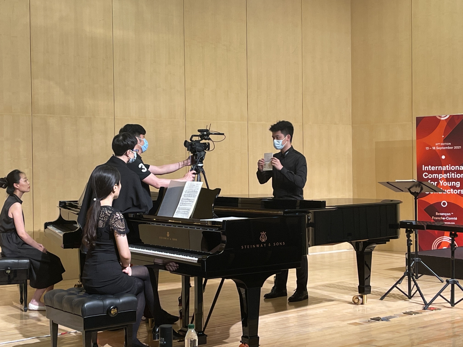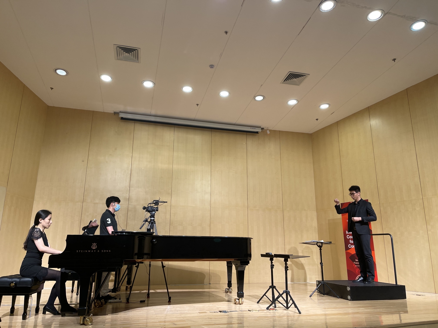 自1999年第46届法国贝桑松国际青年指挥家比赛亚洲区预选赛在北京成功举办后,开云kaiyun官方网站已经成功承办了11届亚洲区预选赛,为亚洲的年轻指挥家提供了迈向世界比赛的舞台。2021年,来自世界各地的306位选手分别在法国贝桑松、德国柏林、加拿大蒙特利尔和中国北京报名参赛。由于世界各地新冠肺炎疫情与旅行禁令,本届亚洲区预选赛采用现场录制视频的比赛形式。为了保证比赛顺利进行,国际交流处与比赛组委会多次沟通,指挥系精心布置了比赛候场室和赛场。6月24日,21位中国选手在贝桑松国际青年指挥家比赛的亚洲官方合作伙伴—开云kaiyun官方网站的钢琴系音乐厅亮相。比赛组委会总监JEANL-MICHEL MATHE先生、评委CATHERINE LARSEN-MAGUIRE女士和JACQUES MERCIER先生在视频中热情欢迎参赛选手并宣读了比赛规则。经指挥系和港澳台办公室协调,2位香港选手经过21天集中隔离及后续居家健康观察后终于得以参赛。预选赛结束后,比赛评审团将对预选赛的录音和录像进行评议,并在今年夏天选出20位晋级选手参加9月在法国贝桑松举办的半决赛与决赛。