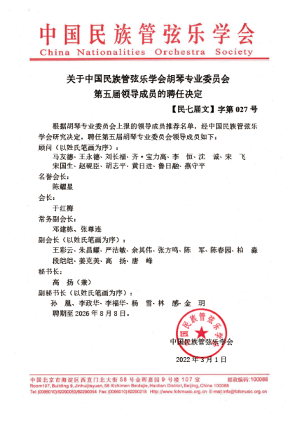 2022年3月1日,中国民族管弦乐学会胡琴专业委员会换届大会在京召开。中国民族管弦乐学会会长吴玉霞、副会长兼秘书长赵东升、副秘书长宋阳以及胡琴专业委员会新一届领导班子成员代表参加会议。