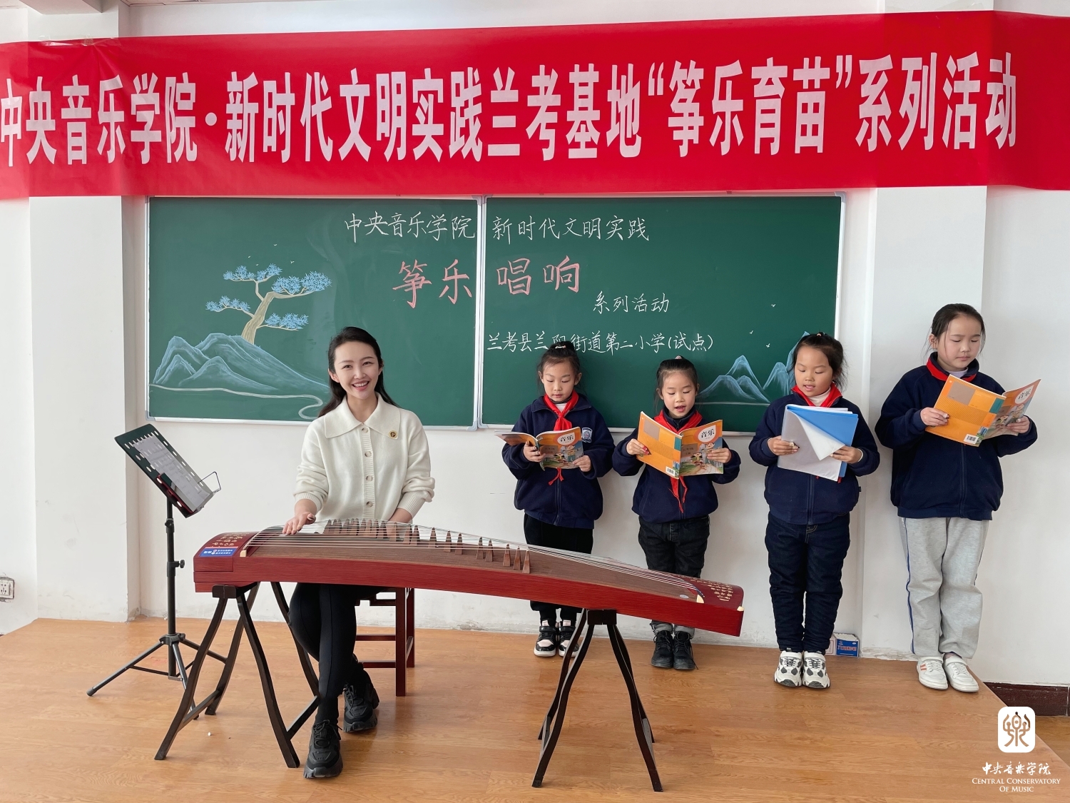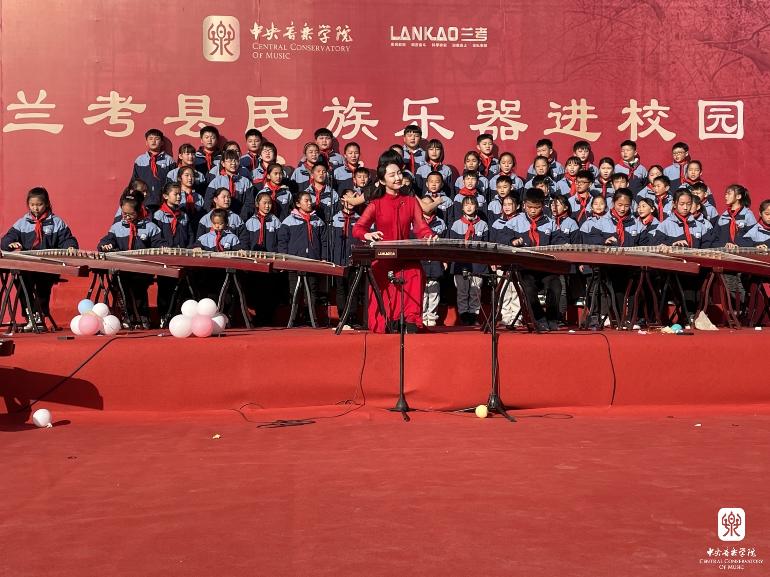 2021年12月3日,兰考县民族乐器进校园启动仪式上,开云kaiyun官方网站李杨冠宇老师带领兰考“筝乐团”与“合唱团”的孩子们现场演出了全新改编的作品《留给我》。兰考县委书记李明俊、组织部部长张卫波、副县长代鑫桥等领导现场聆听,对本次教学成果展示给予了高度认可和评价。