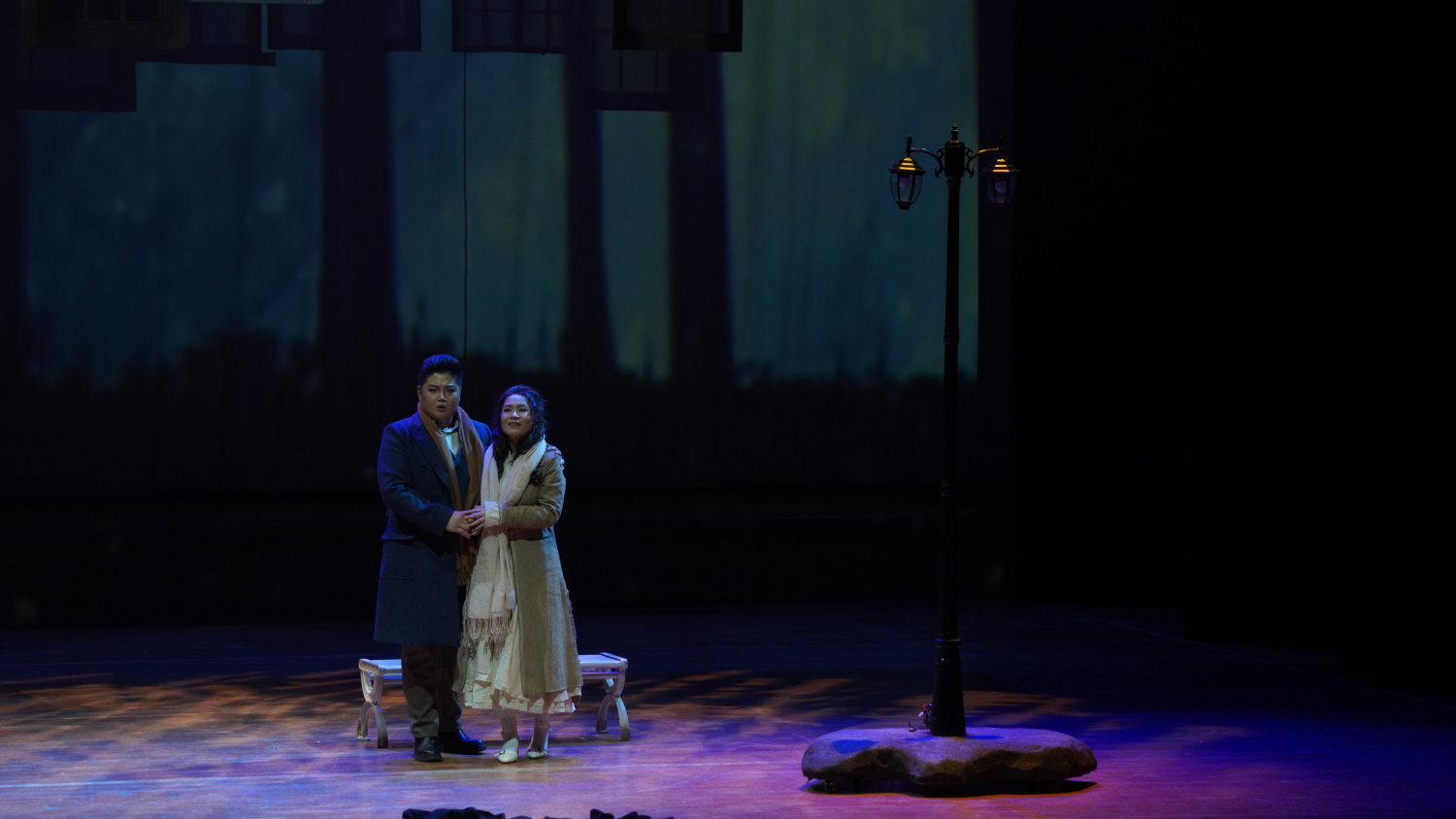 女主角在咪咪唱段的高弱部分和乐句的连贯性上都有出色表现,男主角用声音塑造人物形象和情感性格毫无偏差。他们在上半场的表现略显谨慎,下半场则挥洒自如。非常打动笔者的是,除咪咪和鲁道夫以外的其他主要角色,不仅给予大量对话式宣叙调以清晰生动的交待,还以热情奔放又鲜活适度的表演为主角留出空间;乐队始终能压住“火候”,在指挥的带领下,沉浸其中,娓娓道来;合唱队员们在舞台上或悠闲、或唏嘘,俨然“老戏骨”,他们的诠释为整部歌剧着色不少;舞美简洁大气,阁楼、酒馆、几扇窗、一束光,艺术家的爱情与生命昭然若揭。整部歌剧,从音乐到演唱,从剧情到表演都衔接紧密,一气呵成,毋庸置疑地体现出演出团队的专业素质和职业水准,一句话:“范正儿”!