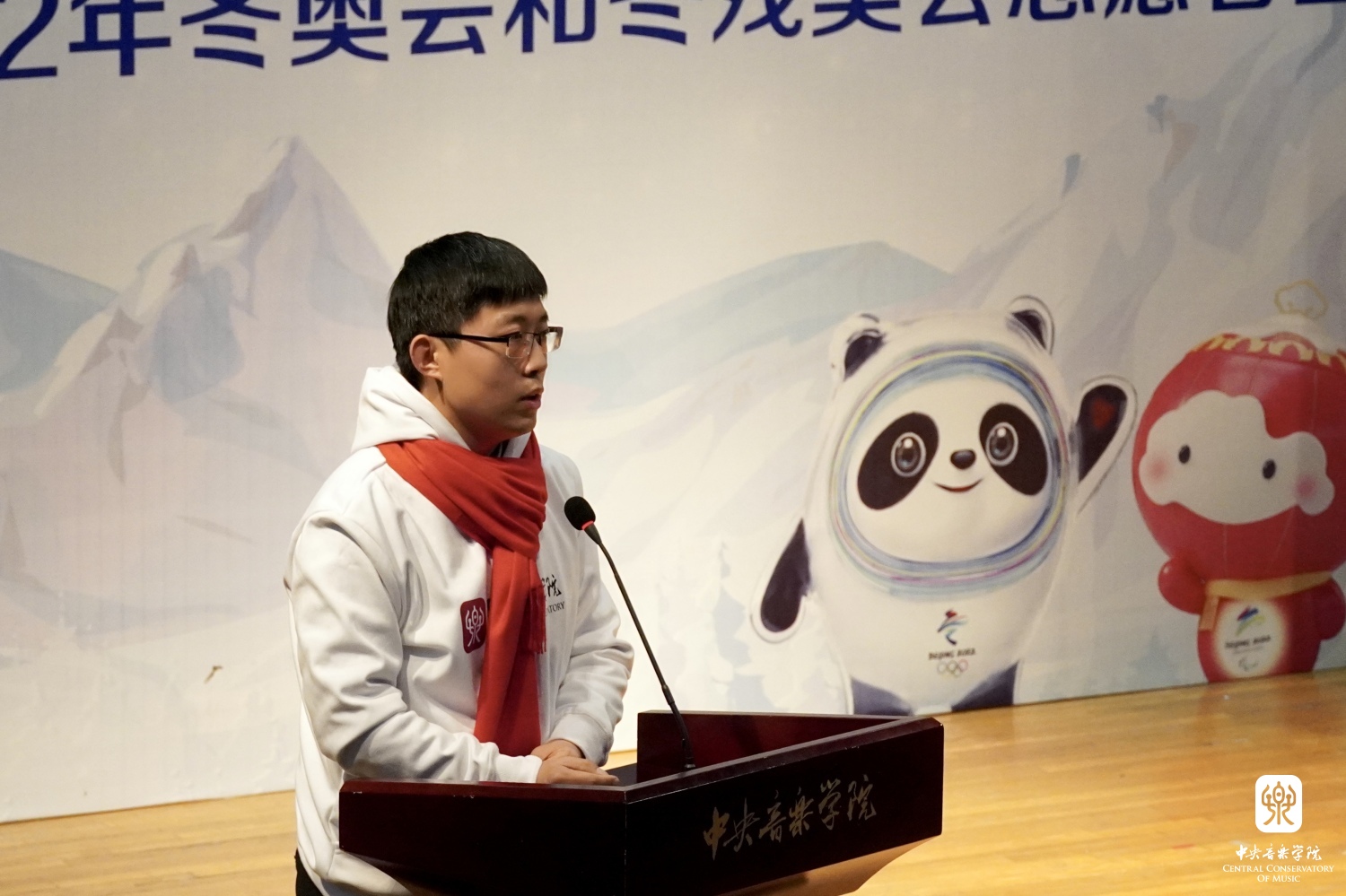 冬奥会志愿者代表民乐系2021级研究生招天弋同学,与大家分享了他与奥运的故事。2008年,他遗憾错过了参与北京奥运会的机会;2015年,当得知北京张家口2022冬季奥运会申奥成功时,他再次燃起了参与奥运的激情与期待;终于在2022年,他实现愿望,成为了冬奥会的一名志愿者。“让我们秉持绿色、共享、开放、廉洁的办奥理念,带着更快、更高、更强,更团结的口号,共同期待央音青年北京冬奥志愿者的风采,在冬奥盛会中热情绽放!”