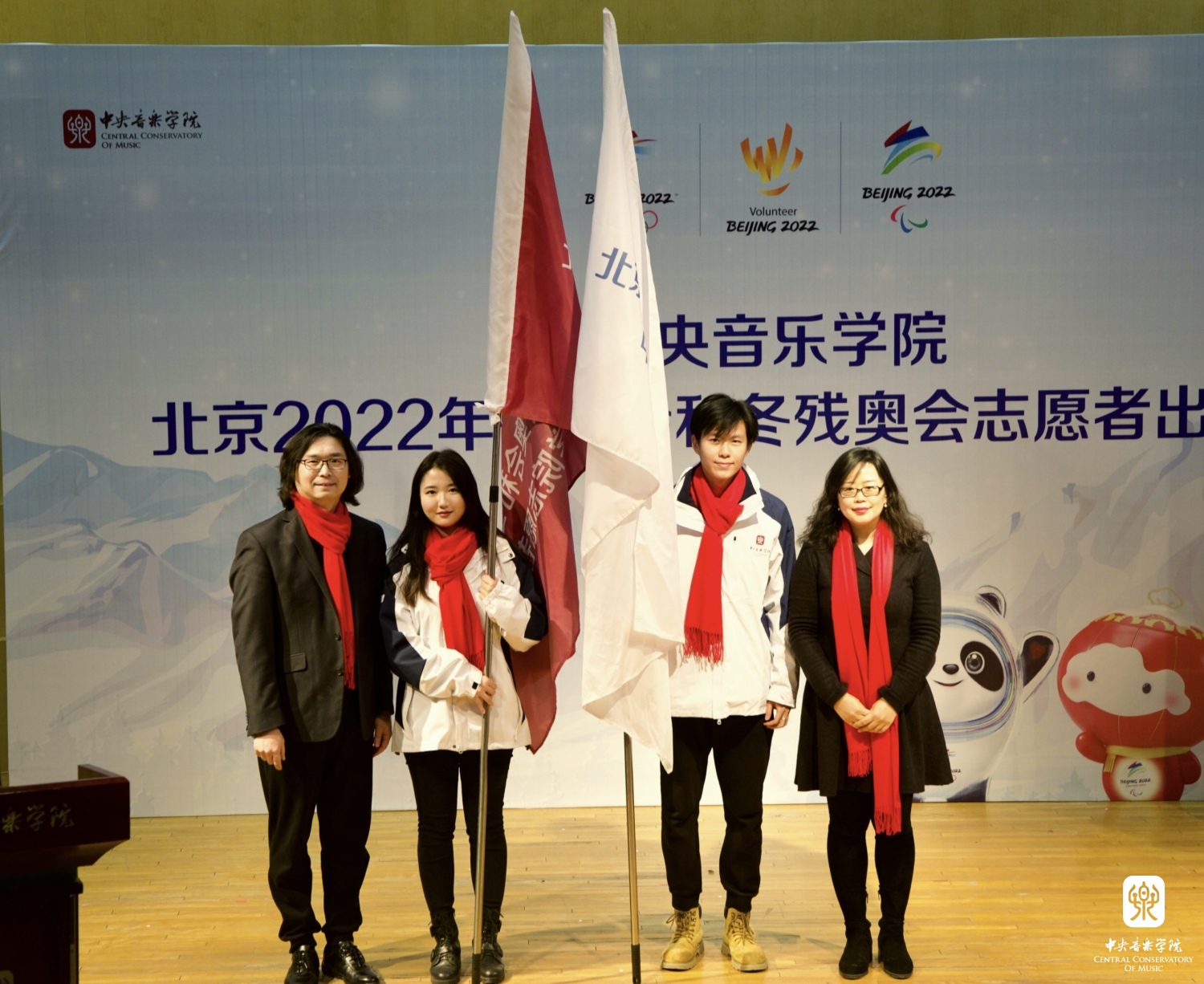 在授旗仪式环节,学生工作部副部长刘兴辰老师(主持工作)、叶冬梅老师为两位志愿者代表授旗,接下旗帜的同时,央音冬奥会志愿者也将承担起在冬奥会、冬残奥会服务的职责。