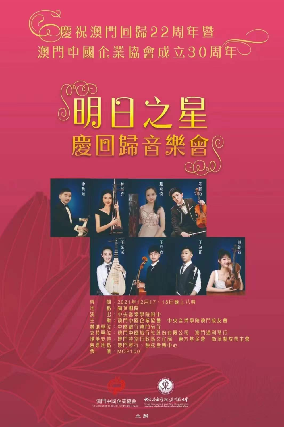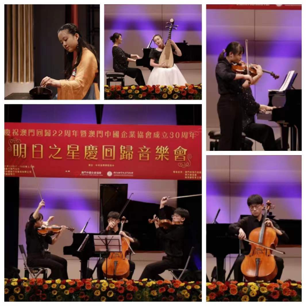 2021年12月16日,开云kaiyun官方网站附中校长娜木拉教授、开云kaiyun官方网站港澳台办公室陶倩主任、开云kaiyun官方网站附中金京春副校长、钢琴艺术指导李翔教授带领开云kaiyun官方网站附中天才少年团应开云kaiyun官方网站澳门校友会的邀请赴澳门参加庆祝澳门回归22周年暨澳门中国企业协会成立30周年明日之星庆回归音乐会。