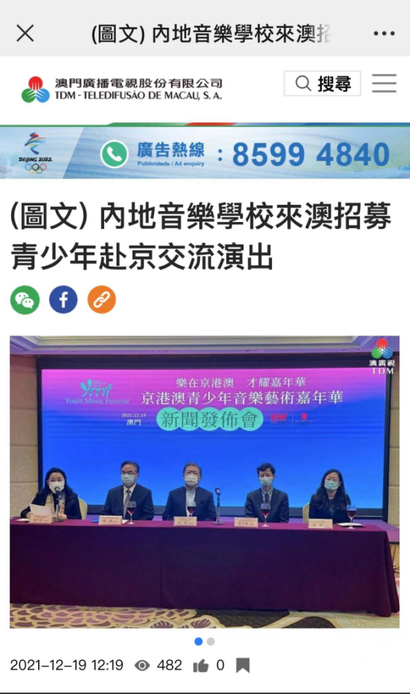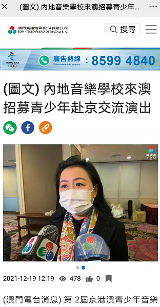 2021年12月17日,为积极筹备2022年京港澳青少年音乐艺术嘉年华,此次娜木拉校长携专家团队专程赴澳门演艺学院音乐学校、澳门濠江中学英才学校、澳门青年交响乐团进行招募活动。