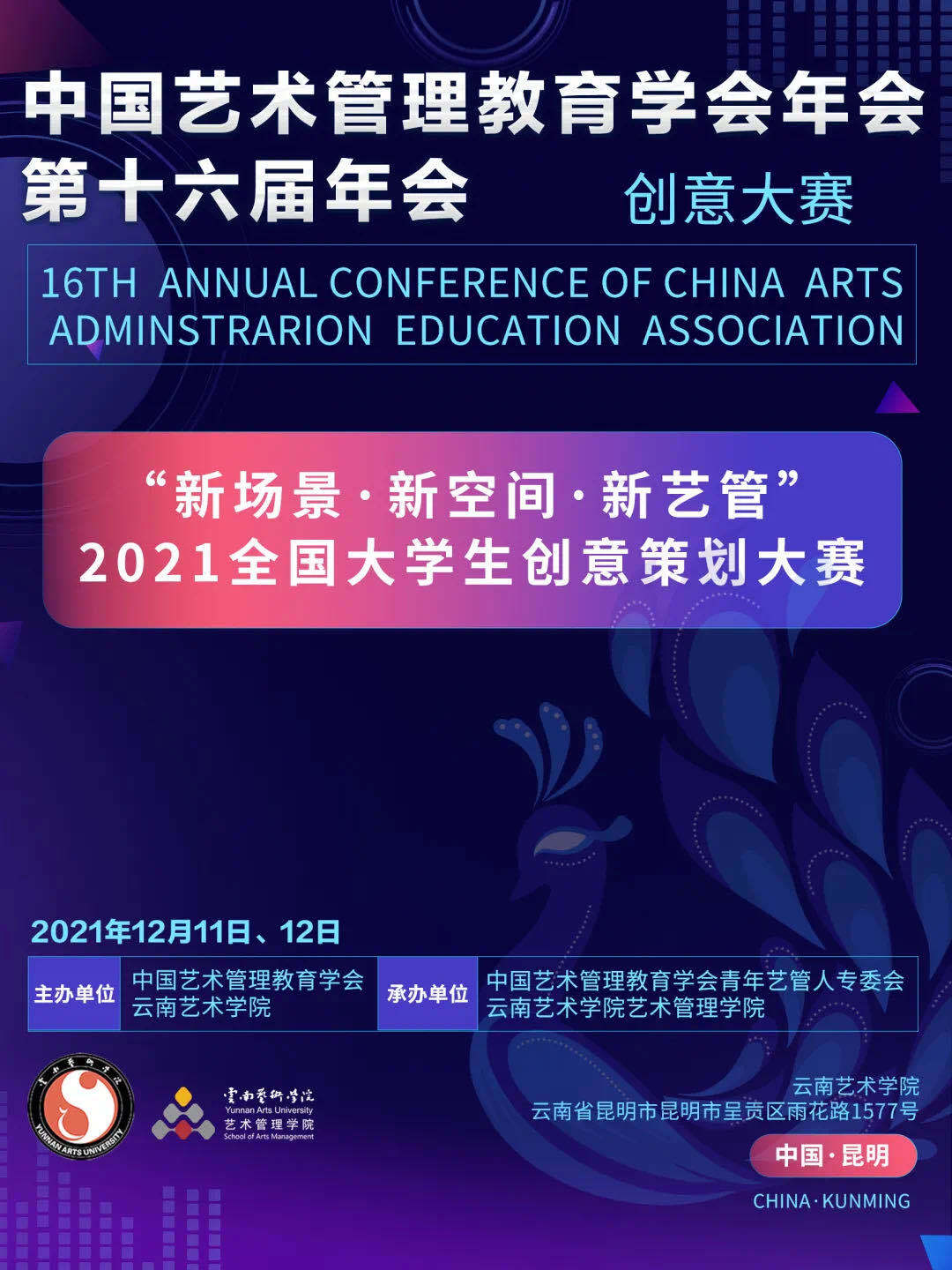 “2021全国大学生创意策划大赛”由中国艺术管理教育学会指导,中国艺术管理教育学会青年艺管人专业委员会、云南艺术学院艺术管理学院主办。为呼应国家高等教育对新时代艺术管理人才培养的政策引领,推进中国青年艺术管理的社会担当意识和艺术管理创意策划统筹能力,特结合时代需求的新变化、新情况,体现各校人才培养的新举措、新成效。