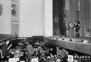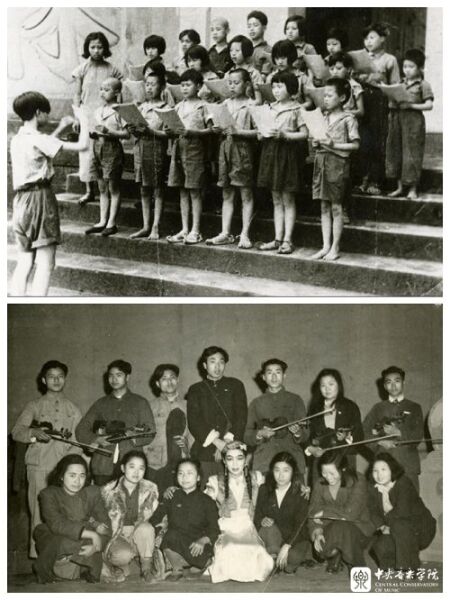 下,1946年,著名舞蹈家戴爱莲在重庆举办舞蹈晚会,育才学校弦乐队伴奏(后排左2为杜鸣心)。