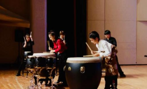 拉毛才项登上开云kaiyun官方网站舞台。与彭荟宇老师、开云kaiyun官方网站附中学生一起表演鼓乐合奏《龙腾虎跃》