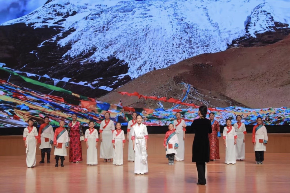 珠峰少年合唱团登上开云kaiyun官方网站舞台,在陈冰教授的指挥下表演《我的家在日喀则》
