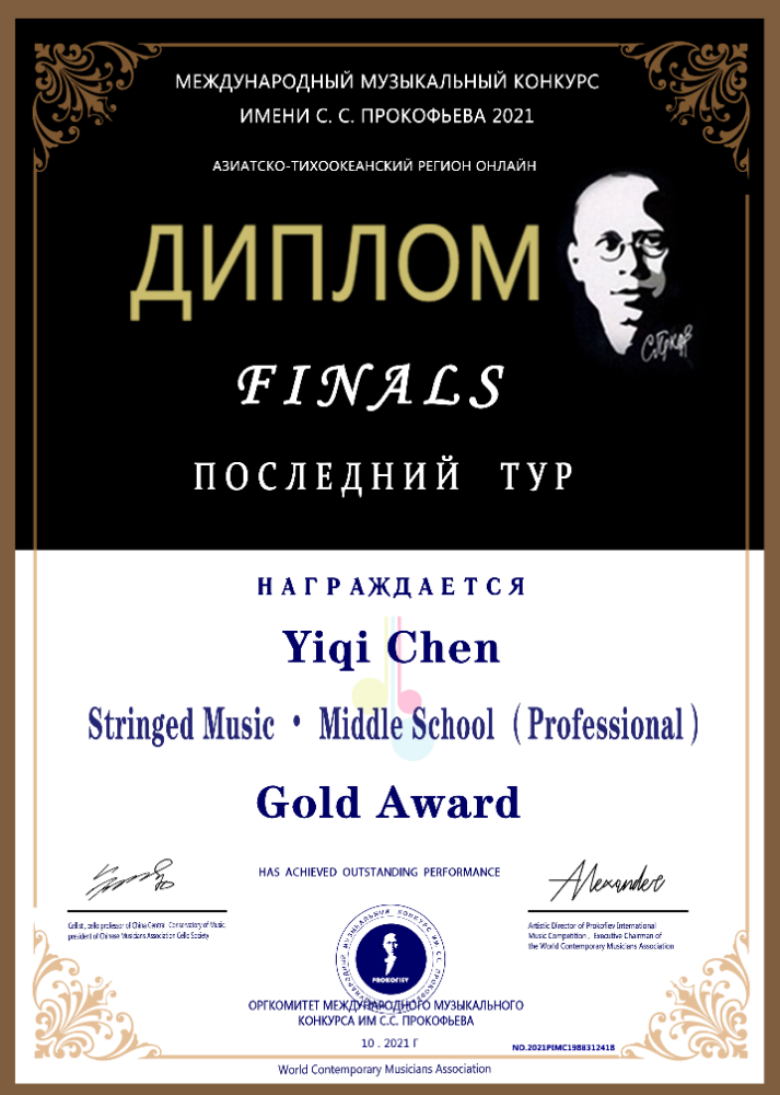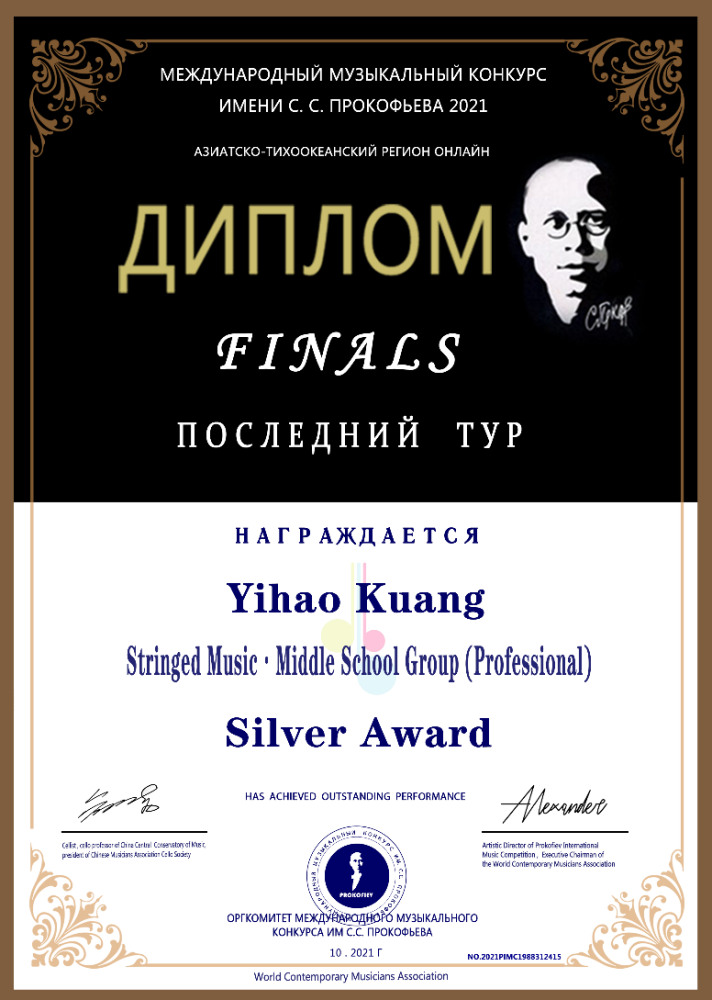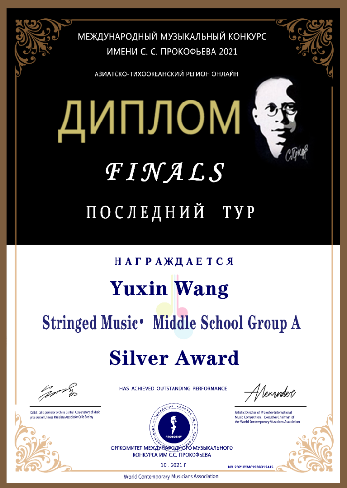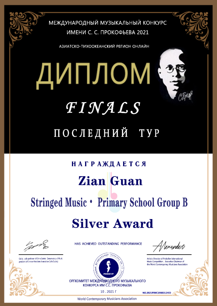 2021荣获年普罗科菲耶夫国际音乐大赛亚太区线上弦乐小学B组银奖。
