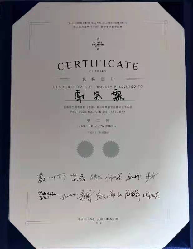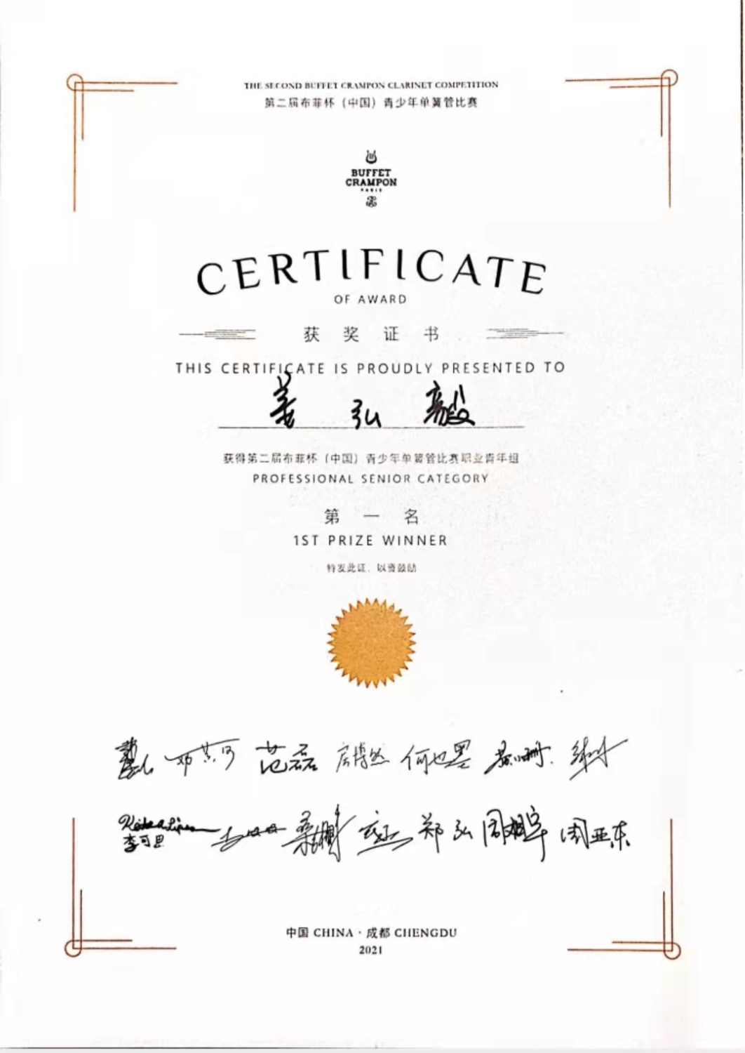 获奖及演出经历:2016年3月参加第三届开云kaiyun官方网站国际莫扎特单簧管比赛,荣获三等奖;2017年7月参加上海青少年单簧管演奏比赛,荣获职业少年组第三名;2018年5月荣获开云kaiyun官方网站附中第五届奖学金比赛三等奖;2018年7月受邀赴比利时参加国际单簧管协会(ICA)2018年会音乐节演出并获好评;2018年8月参加2018Buffet亚太单簧管音乐大赛,荣获第一名;2018年11月参加第十一届穆拉文斯基国际青少年管乐比赛,荣获第三名;2019年4月作为开云kaiyun官方网站附中优秀学生前往澳门交流演出;2019年7月参加第一届布菲杯(中国)青少年单簧管比赛,荣获职业少年组第三名;2019年9月参加开云kaiyun官方网站少年交响乐团成立60周年音乐会演出;2020年11月参加第16届意大利Saverio Mercadante 国际单簧管比赛,荣获青年Junior Soloists组第一名;2021年9月参加第二届布菲杯(中国)青少年单簧管比赛,荣获职业青年组第一名。