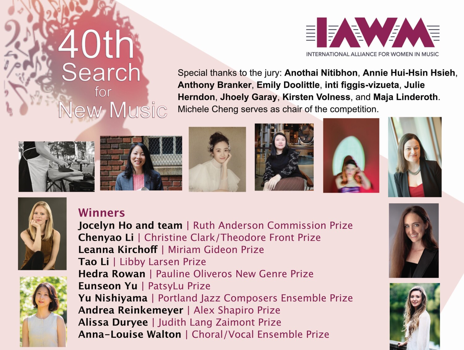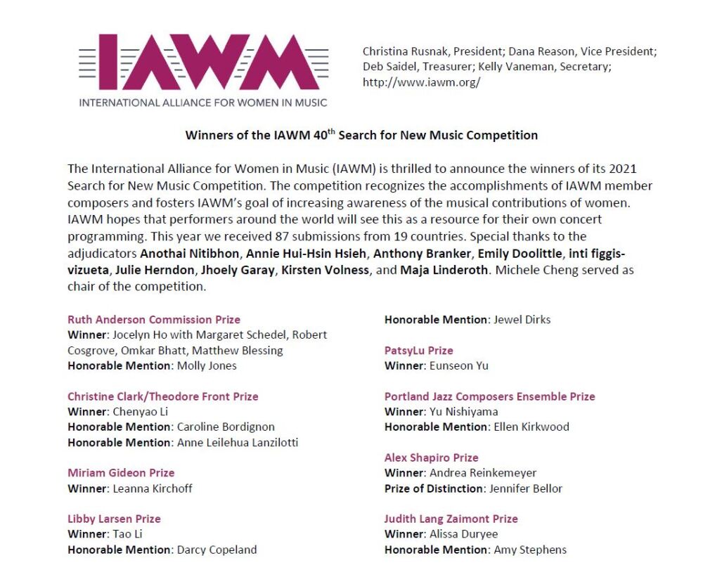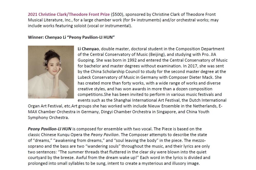 国际女性音乐联盟(IAWM)总部设在美国,作为一个国际性音乐组织,其长期以来致力于促进和鼓励全球女性在音乐领域的活动,宗旨为推动全球女性在各音乐领域中的平等地位。作为IAWM的核心项目之一,新音乐作品比赛(SNM)自1982年起每年面向全球女性音乐家征集新作品,至2021年已是第四十届。该比赛针对不同编制及形式作品(装置音乐、大室内乐、声乐、木管乐队等)设立不同奖项,如Ruth奖、Christine奖、Choral奖、Alex奖等,每个奖项每年在全球范围内评选出一位获奖者。本届大赛征集到来自19个国家及地区的87部参赛作品,经过为期两个月的评选,大赛组委会评选出最终结果。李晨瑶创作的大室内乐作品《牡丹亭·离魂》荣获Christine Clark大奖,Christine Clark大奖由美国Theodore Front音乐文学公司赞助,为获奖者提供作品推广机会和奖金鼓励。