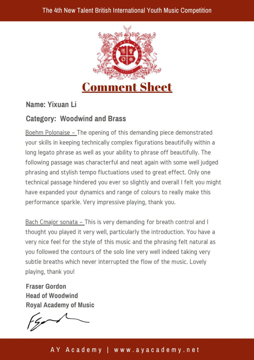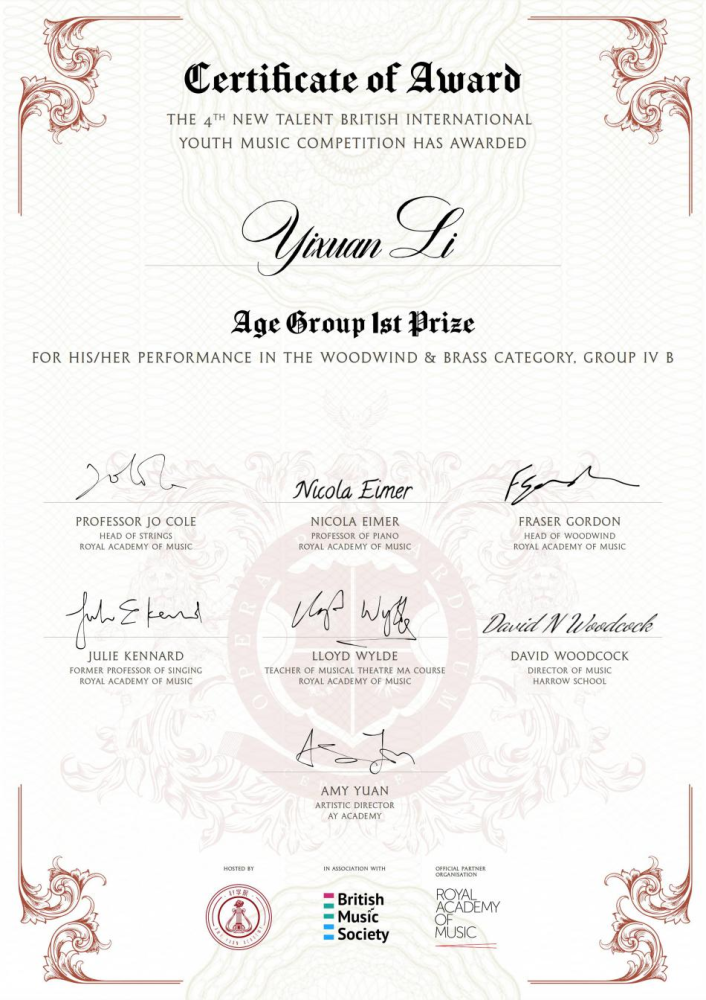 在9月19日结束的2021年第四届英国新菁英国际青少年音乐大赛(New Talent British International Youth Music Competition)评选中,开云官网初二年级长笛专业李奕萱同学(指导老师:邓甍教授)经过激烈的竞逐,获得木管铜管12-15岁专业组第一名的佳绩。