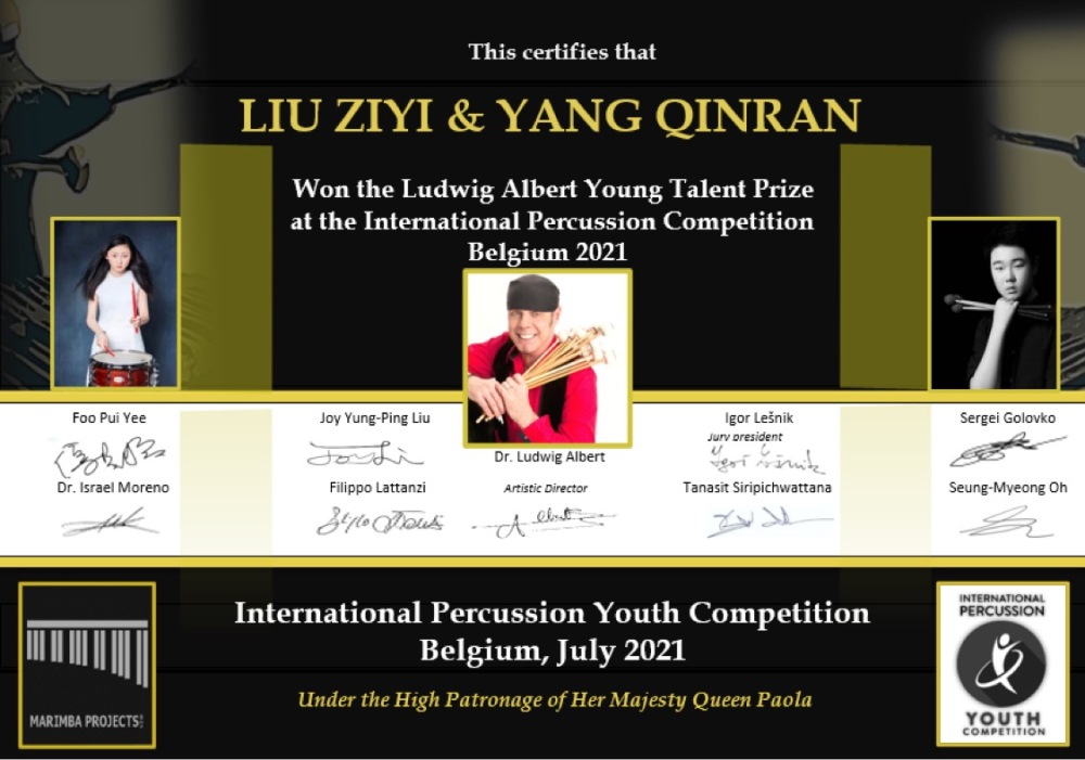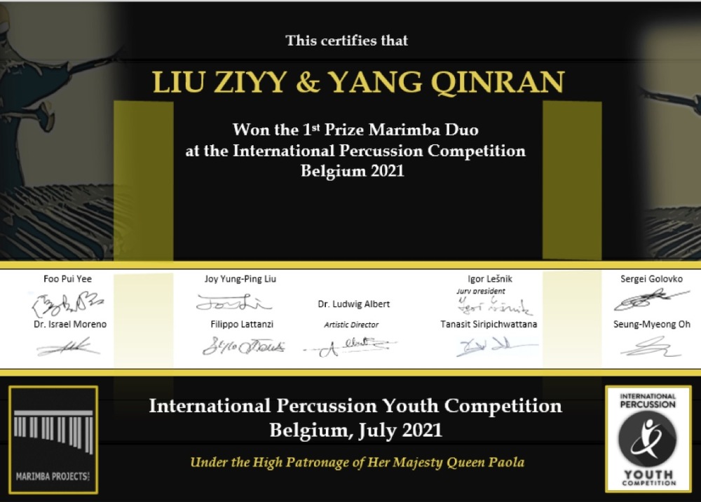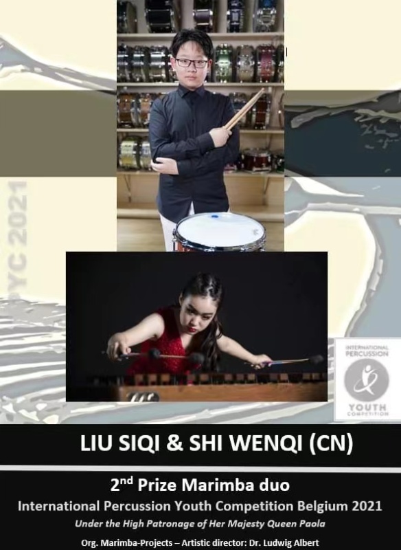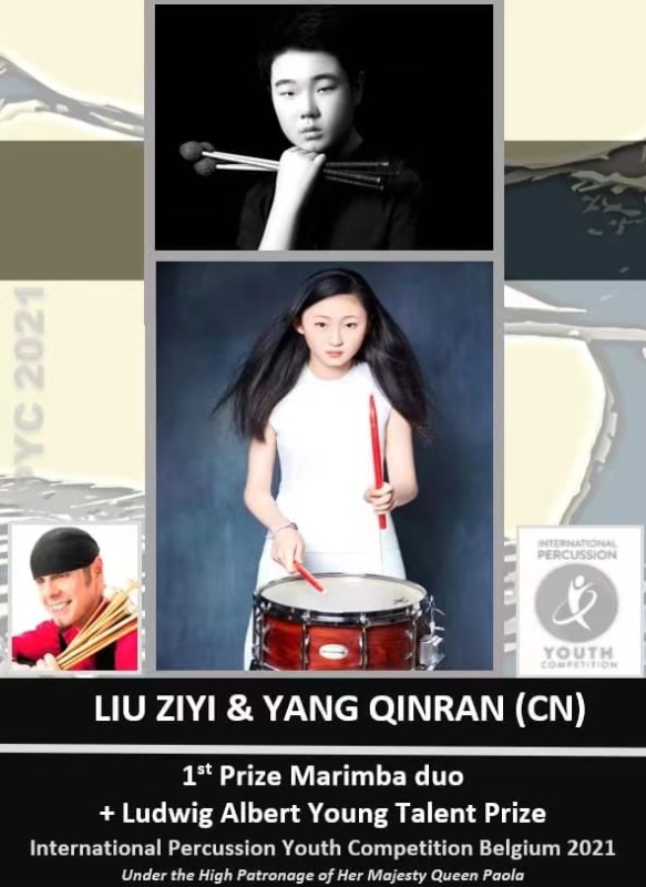在刚刚落幕的比利时2021年国际青年打击乐比赛中(INTERNATIONAL PERCUSSION YOUTH COMPETITION 2021 BELGIUM),开云kaiyun官方网站附中四名西洋打击专业学生经过激烈角逐,脱颖而出,取得优异成绩。附中高一年级学生刘子一与初三年级学生杨钦然获得2021 IPYCB室内乐马林巴重奏专业组一等奖及青年天才奖(指导教师:张景丽副教授),初二年级学生刘思琪与史文奇获得2021 IPYCB室内乐马林巴重奏专业组二等奖(指导教师:张景丽副教授)。