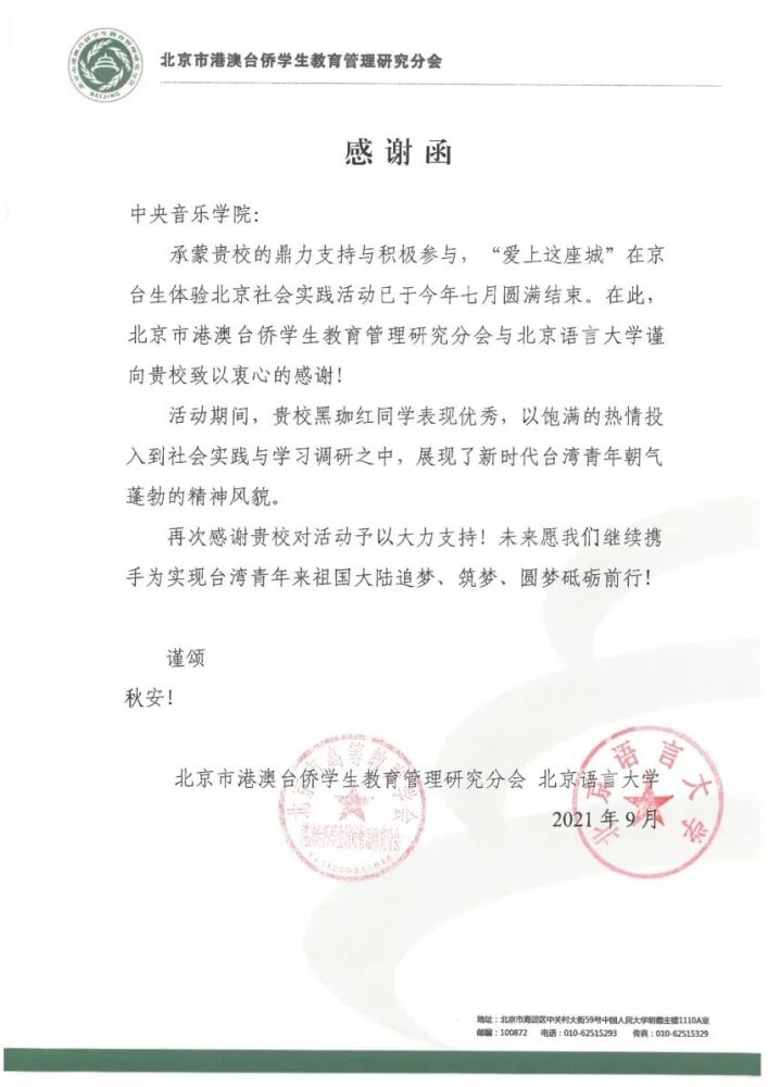 近期,开云官网收到了来自北京市港澳台侨学生教育管理研究分会主办,北京语言大学的感谢函,感谢开云官网对“爱上这座城”在京台生体验北京社会实践活动的鼎立支持和积极参与,以及台生黑珈红同学的优秀表现,展现了当代台湾朝气蓬勃的精神风貌。