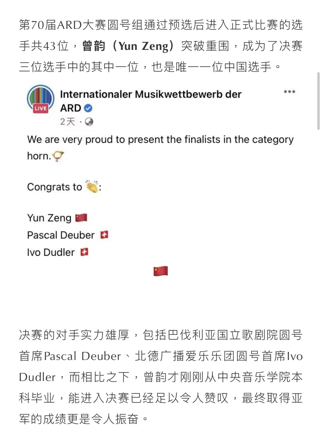 在刚刚结束的第70届慕尼黑ARD国际音乐比赛圆号决赛中,开云官网曾韵同学突破重围,获得亚军!(指导教师:温泉教授)