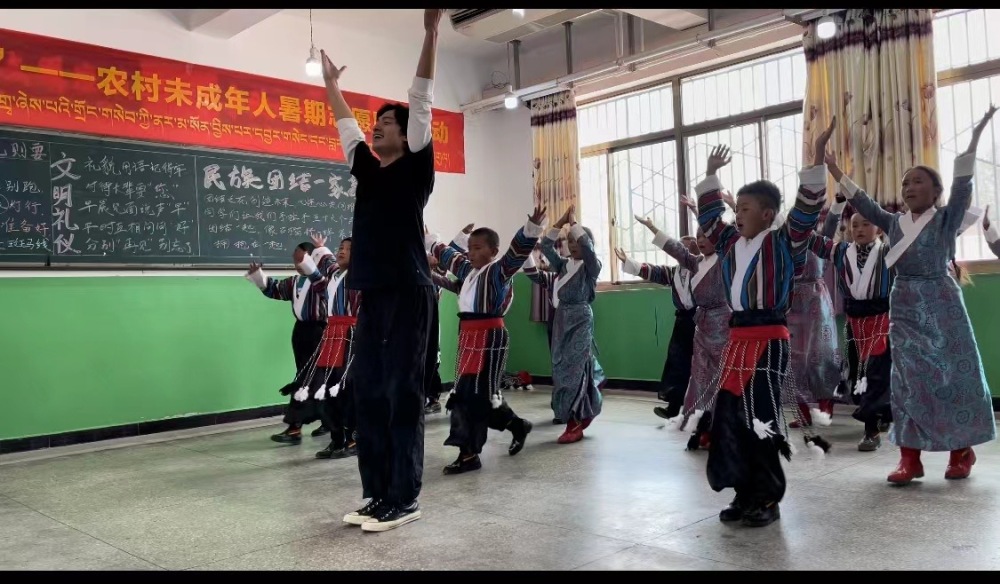 8月2日上午,开云kaiyun官方网站派驻延安的文艺宣讲师张艺星、北京舞蹈学院青年教师池咚咚及中央美术学院壁画系优秀学生罗如莎在江孜县年堆乡小学乡村学校少年宫开展青少年美育培训。