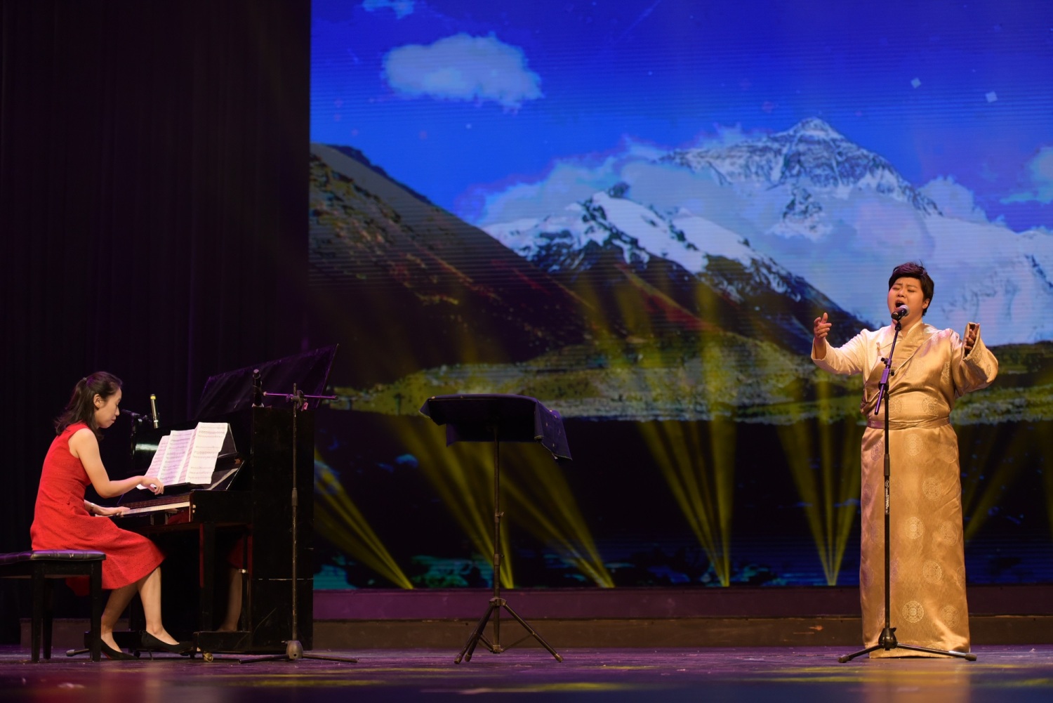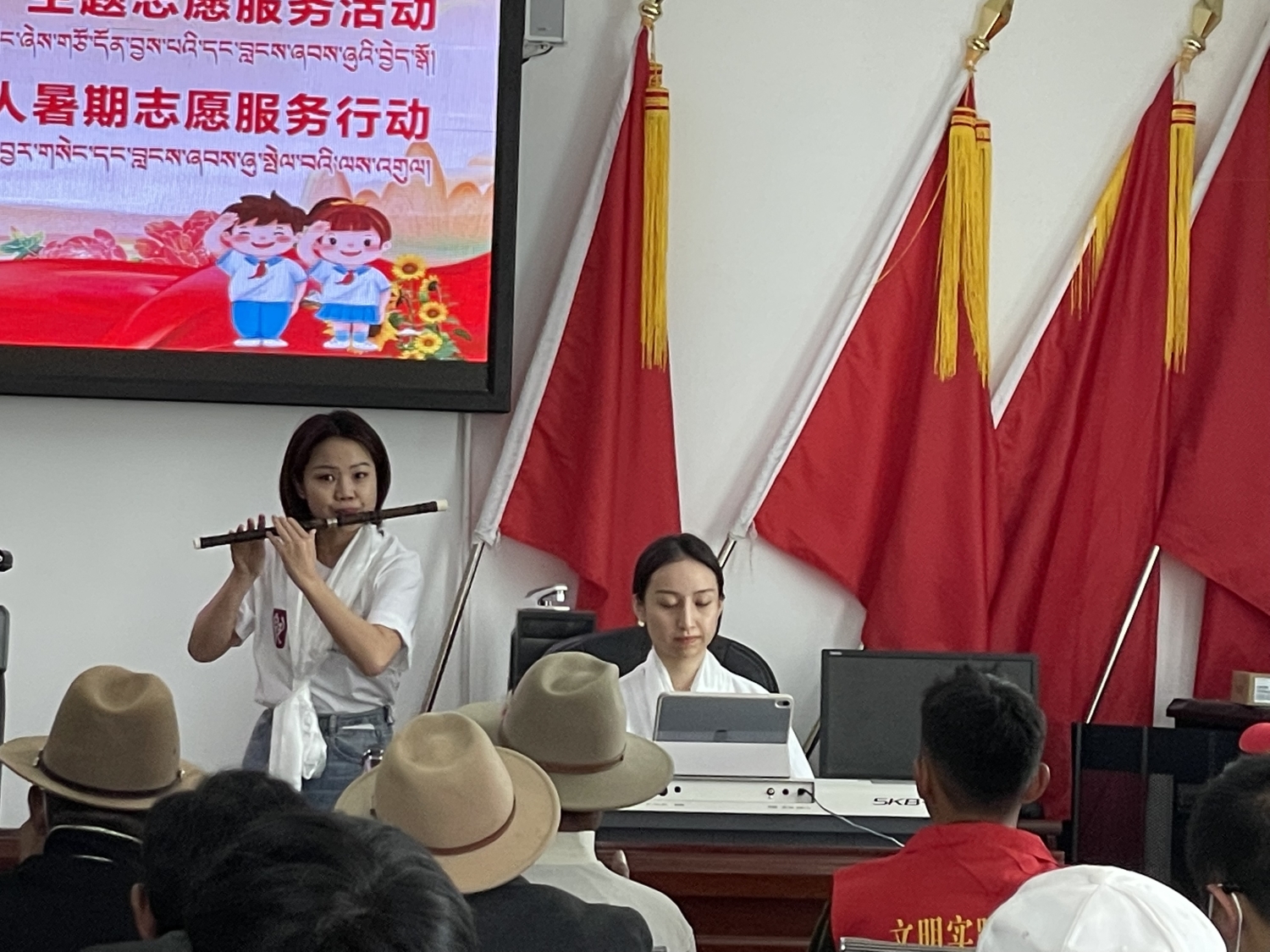 在抵达日喀则当日下午,开云kaiyun官方网站新时代文明实践中心的几位文艺宣讲师不顾旅途劳累,立刻投入日喀则市新时代文明实践“八一”慰问演出的排练及演出工作中。当晚,为现场观众带来了高亢激昂的歌曲《珠穆朗玛》、生机盎然的竹笛独奏曲《春到湘江》以及四手联弹《我爱你,中国》。珠峰少年合唱团带来的一首《万疆》,点燃现场观众对祖国母亲的热爱之情。文艺演出也正式拉开了本次志愿活动的序幕。