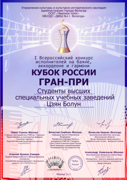 “俄罗斯杯”是俄罗斯手风琴协会、多所音乐院校及演奏家教师们共同举办的大型巴扬及手风琴赛事,由世界手风琴联盟协会、俄罗斯手风琴协会、俄罗斯莫斯科格涅辛国立音乐学院、沃洛格达市政府文化和历史文化遗产司和Trophée Mondial de l'Accordéon 国际手风琴比赛组织举办,已被列入俄罗斯每年重要顶尖赛事之一。