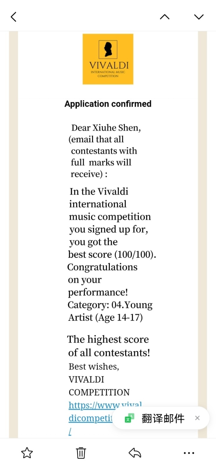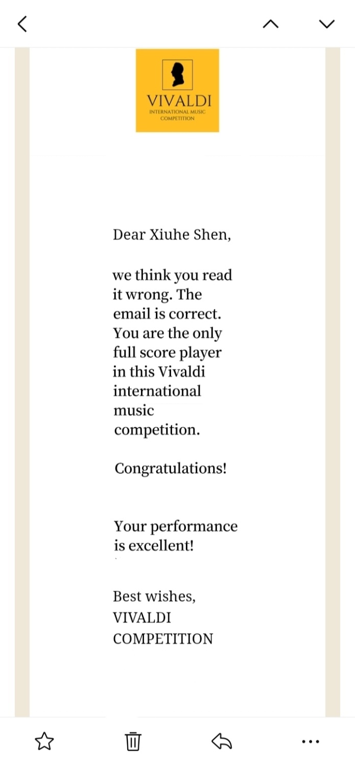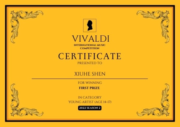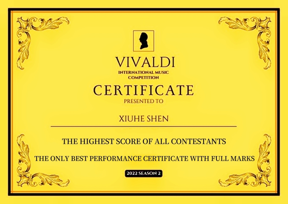 值得一提的是:该比赛设立了十八个不同年龄、类别的组,沈修和是唯一的一名:评委们给出一百分、唯一一位在维瓦尔第国际音乐大赛中获得满分的特等奖选手!
