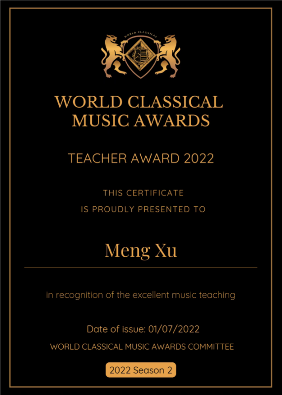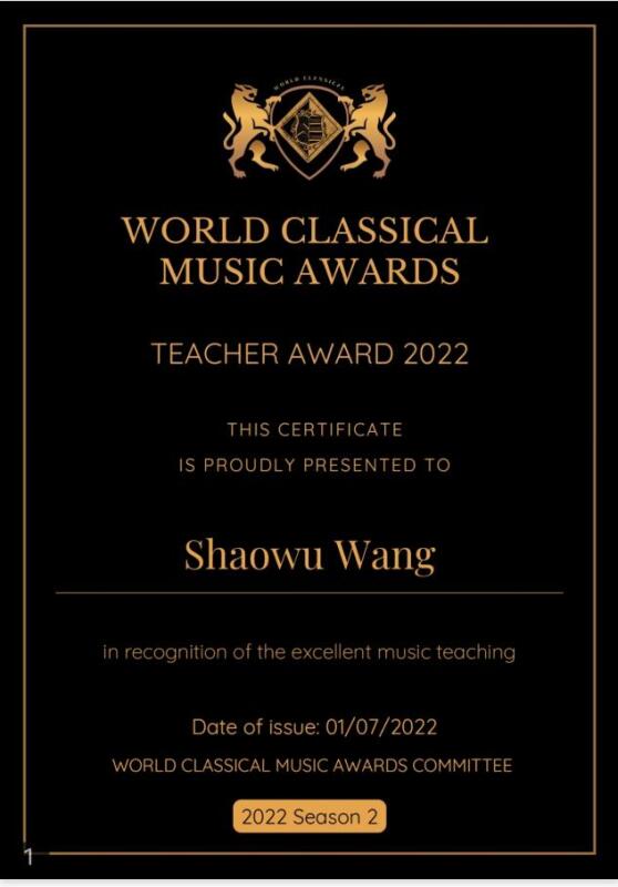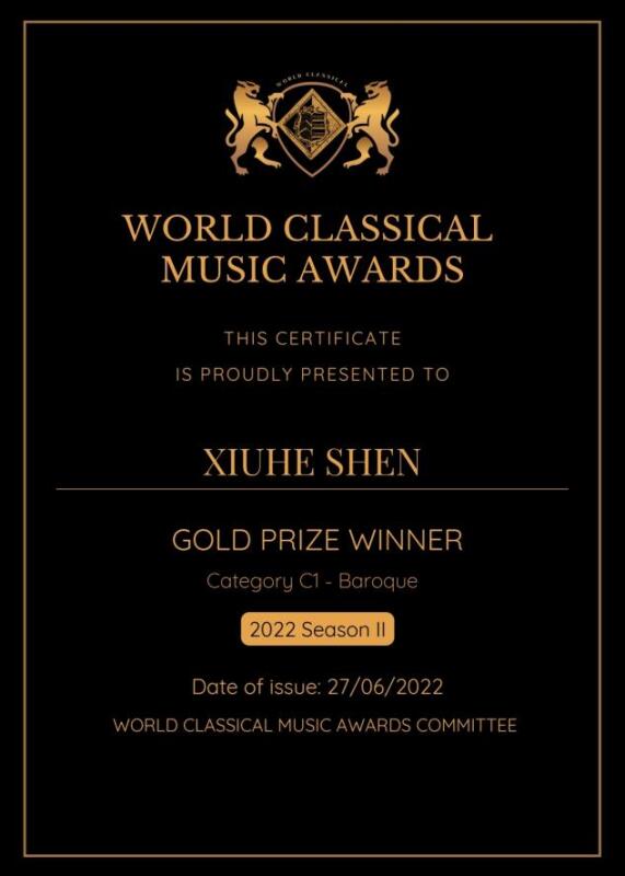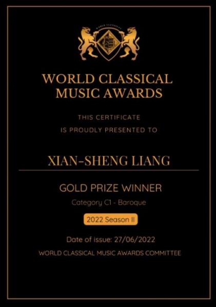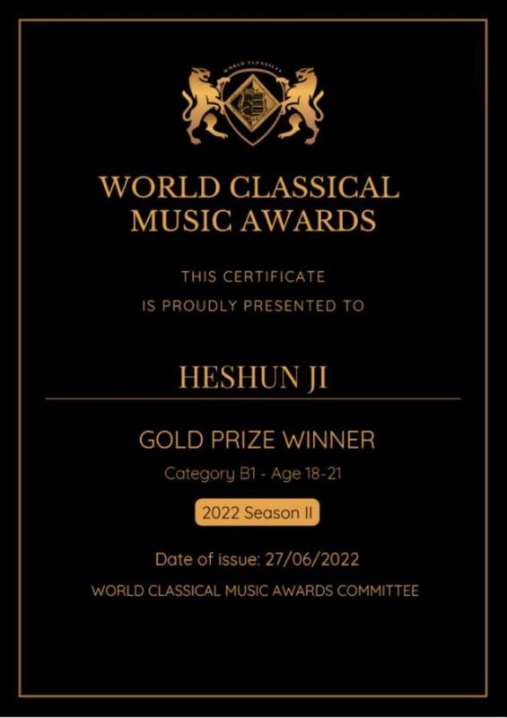 英国世界古典音乐大奖World Classical Music Awards (WCMA)由欧洲音乐家比赛协会、英国True Art古典音乐数字电视台世界新古典音乐家杂志联合举办,是世界音乐家联盟比赛联盟成员。大赛面向世界各地,旨在发掘来自世界各地的杰出音乐人才。2022年由于疫情影响决赛改为线上进行,为指挥、室内乐、器乐独奏等设置金、银、铜三个奖项。