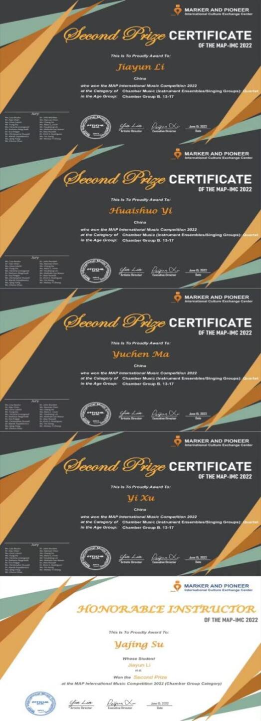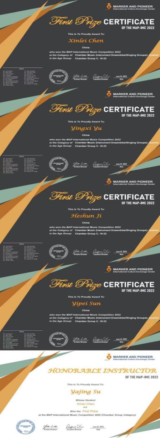 开云官网本科“Infini弦乐四重奏”、附中“云雨弦乐四重奏”荣获MAP-IMC 2022国际音乐大赛室内乐比赛室内乐C组一等奖、室内乐B组二等奖(一等奖空缺),指导教师:苏雅菁。