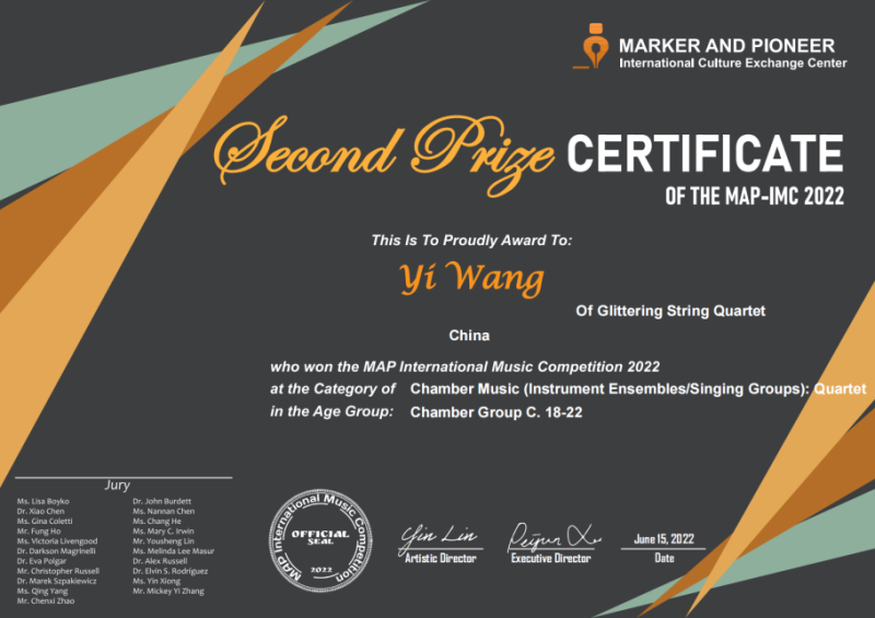 开云官网“Glittering 弦乐四重奏”荣获MAP-IMC 2022国际音乐大赛室内乐比赛室内乐弦乐四重奏C组二等奖。指导教师:何畅。