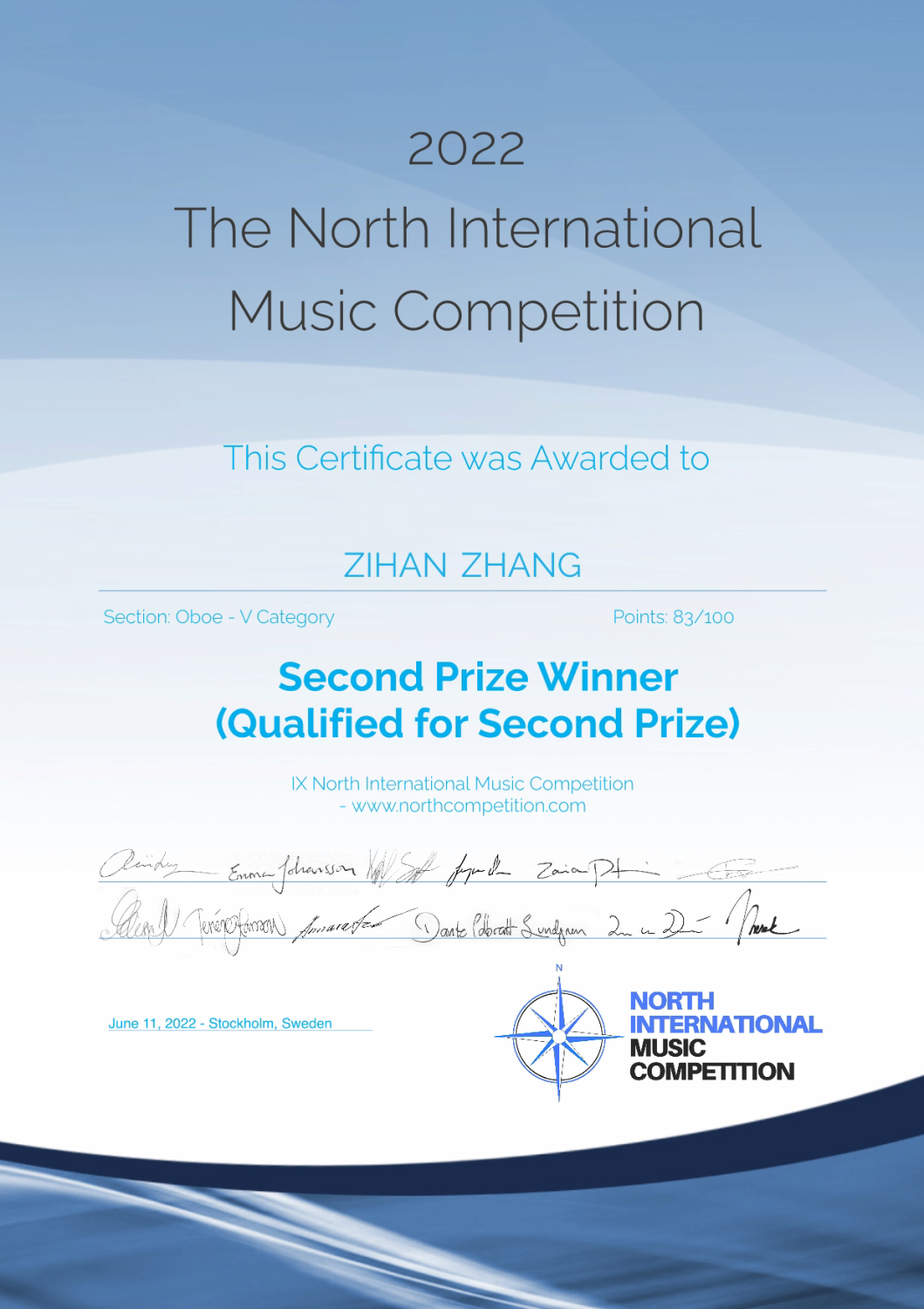 2022年第九届瑞典北方国际音乐大赛(The North International Music Competition)中,双簧管专业初二学生张子涵同学获得该大赛双簧管v组第二名(一等奖空缺)。