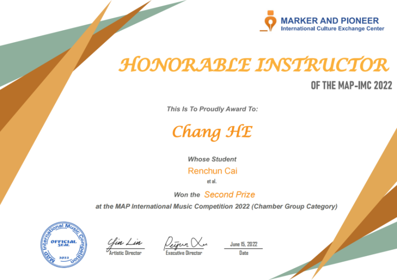 作为教师多名学生及重奏组在国内外赛事中荣获奖项,多次获得优秀指导教师奖。并在国内外音乐比赛、全国音乐等级考试中担任评委。