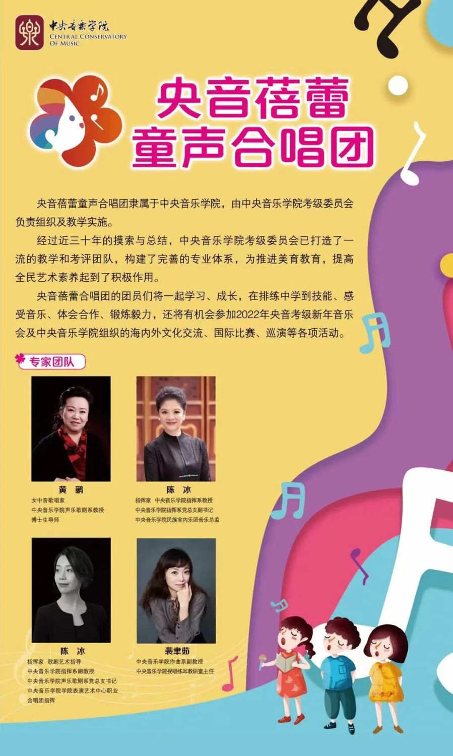 央音蓓蕾童声合唱团隶属开云kaiyun官方网站,由考级委员会负责管理并组织教学,现面向北京地区招收5—12周岁热爱音乐、热爱演唱的少年儿童。只要符合年龄要求,具有良好的音乐素质及能力,就有机会加入合唱团。