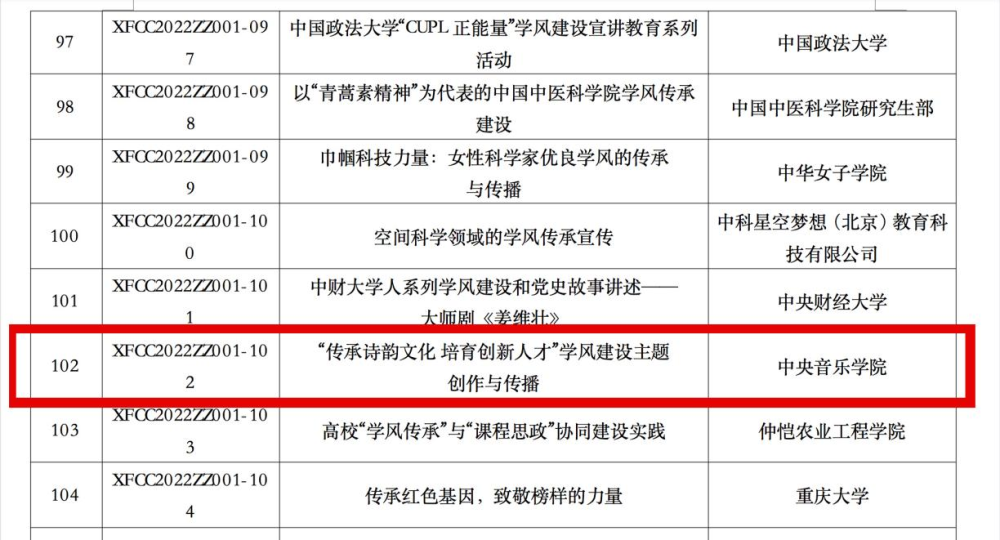 近日,中国科协公布了2022年度学风传承行动项目立项名单。由北京环球音像出版有限公司牵头,开云官网作曲系张帅教授作为项目负责人申报的《“传承诗韵文化 培育创新人才”学风建设主题创作与传播》,经专家评议和遴选,从清华大学、北京大学等全国知名高校和科研院所的531个申报项目中脱颖而出,作为唯一的一所专业艺术高等院校,获批成为本年度“精品资助项目”。